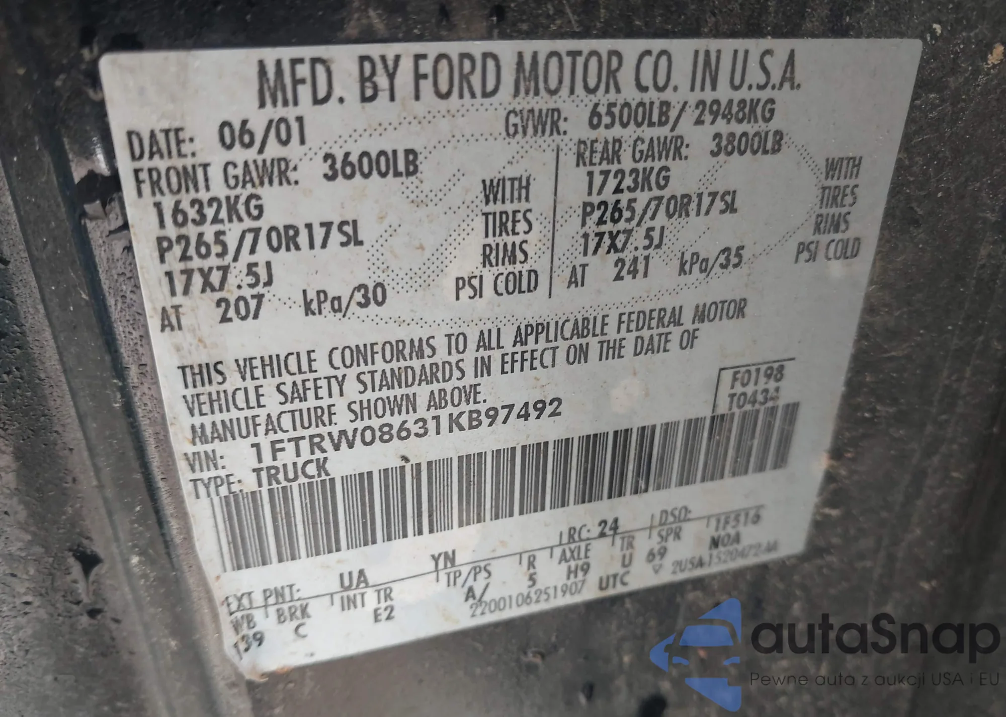 VIN: 1FTRW08631KB97492