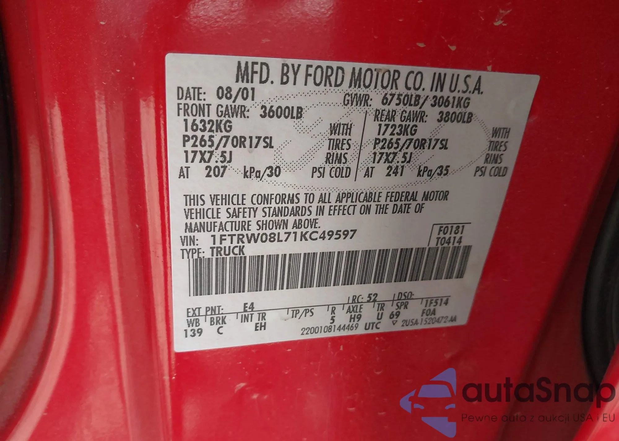 VIN: 1FTRW08L71KC49597