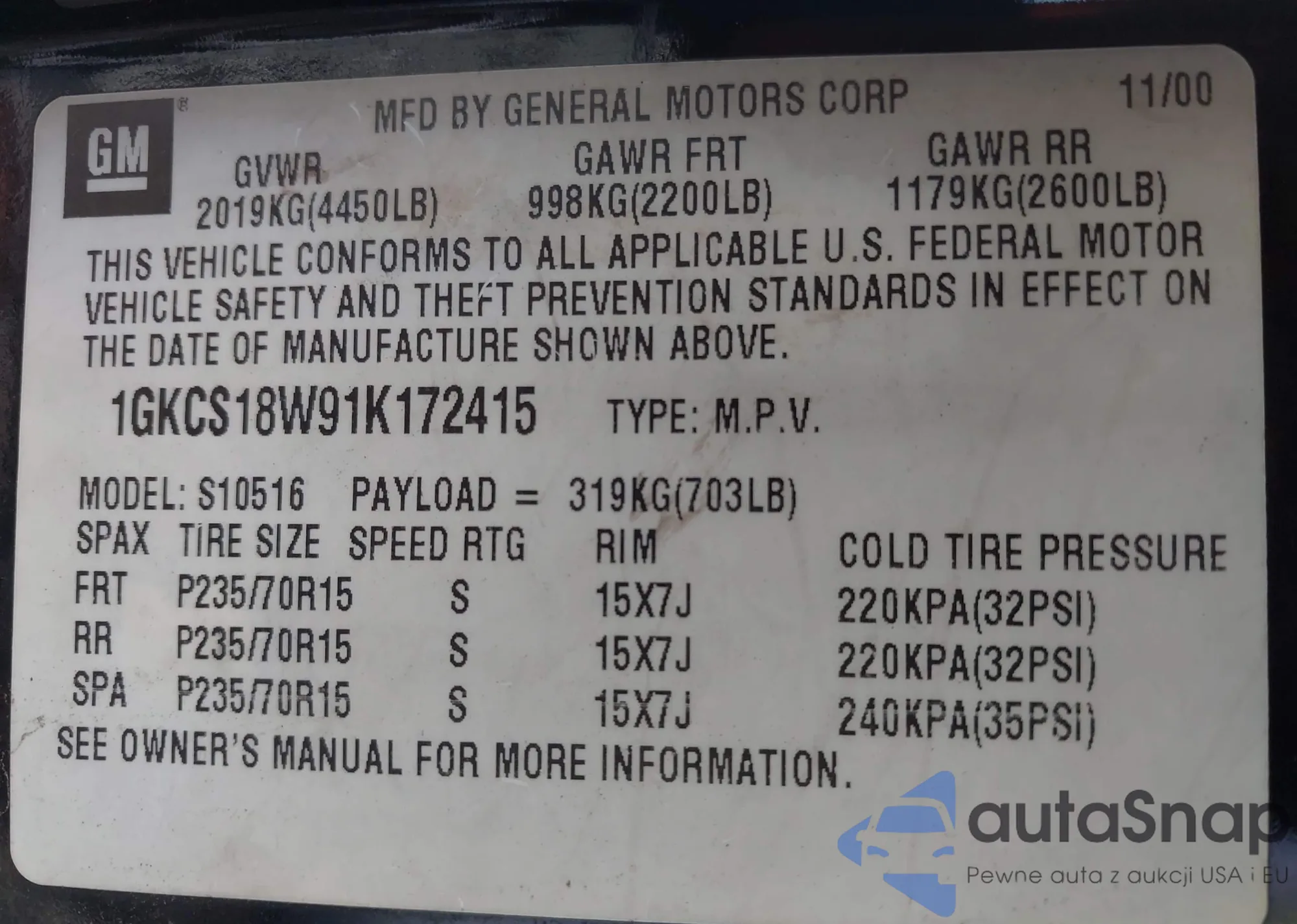 Samochód GMC Jimmy 2001 (VIN 1GKCS18W91K172415) ma dokumenty uniemożliwiające rejestrację. Mogą pojawić się trudności przy eksporcie i rejestracji. Skontaktuj się z ekspertami AutaSnap w celu znalezienia alternatywy.
