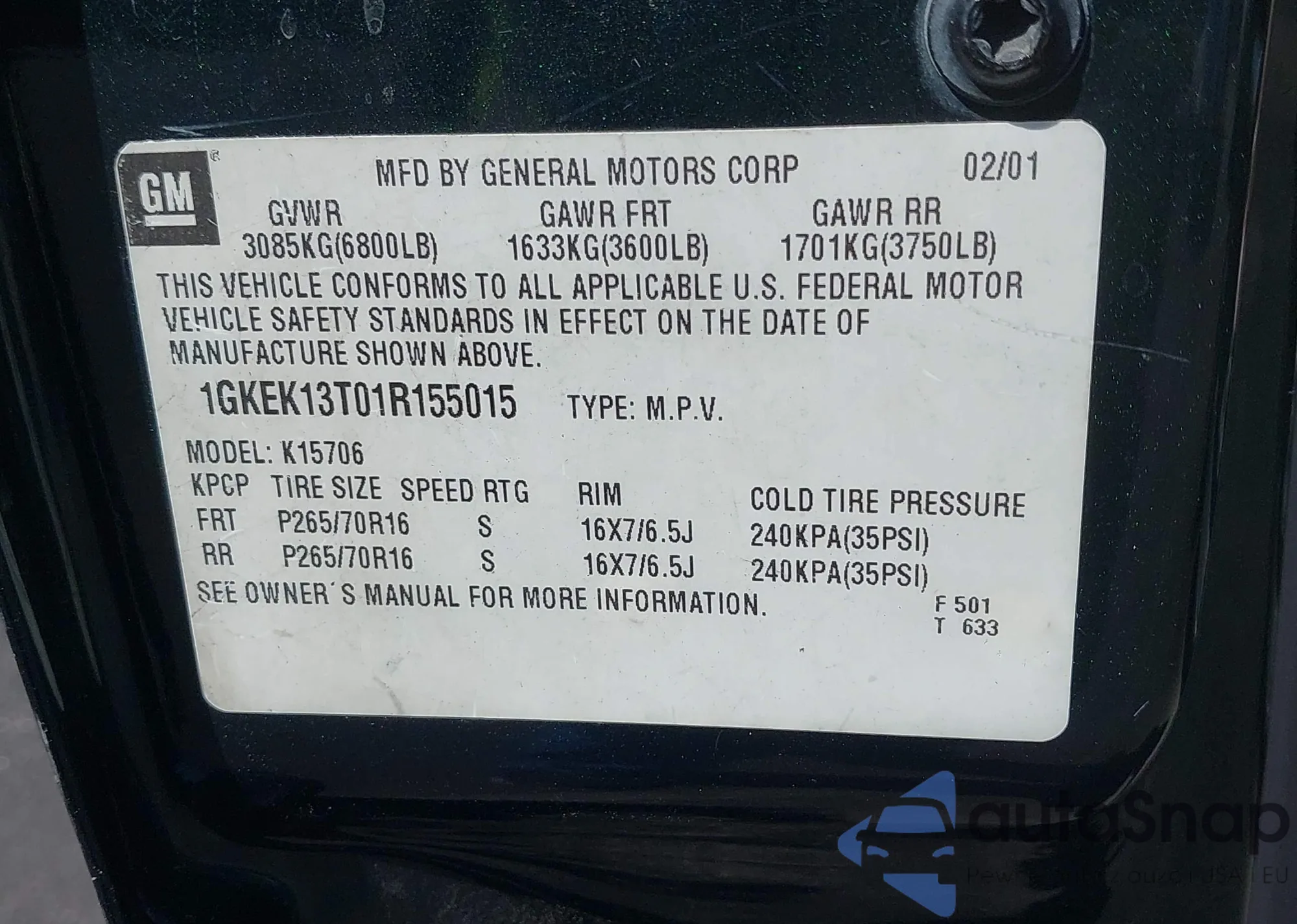 • VIN: 1GKEK13T01R155015