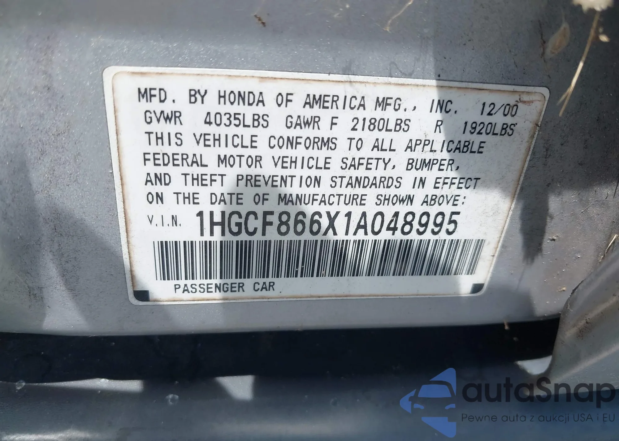 Samochód Honda Accord 2001 (VIN 1HGCF866X1A048995) nie był wcześniej licytowany. Dokumenty są czyste, przebieg odpowiada lub jest niższy niż średnia rynku. Sprzedaje go firma ubezpieczeniowa – polecamy zakup. Dostawa do portu zajmie ok. 6–8 tygodni.
