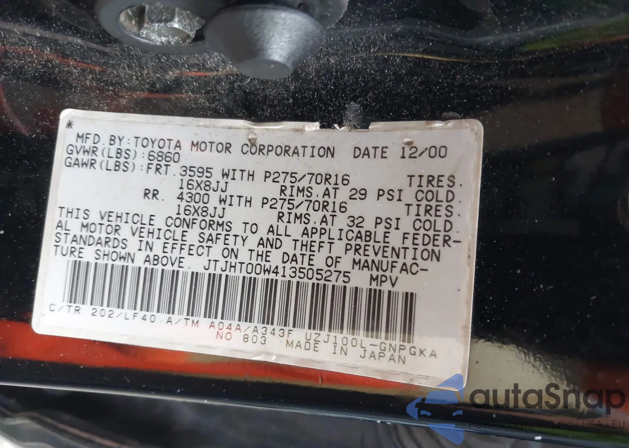 Samochód Lexus LX 2001 (VIN JTJHT00W413505275) sprzedaje go niezweryfikowany sprzedawca. Zalecamy raport Carfax i potwierdzenie możliwości rejestracji pojazdu przed zakupem.