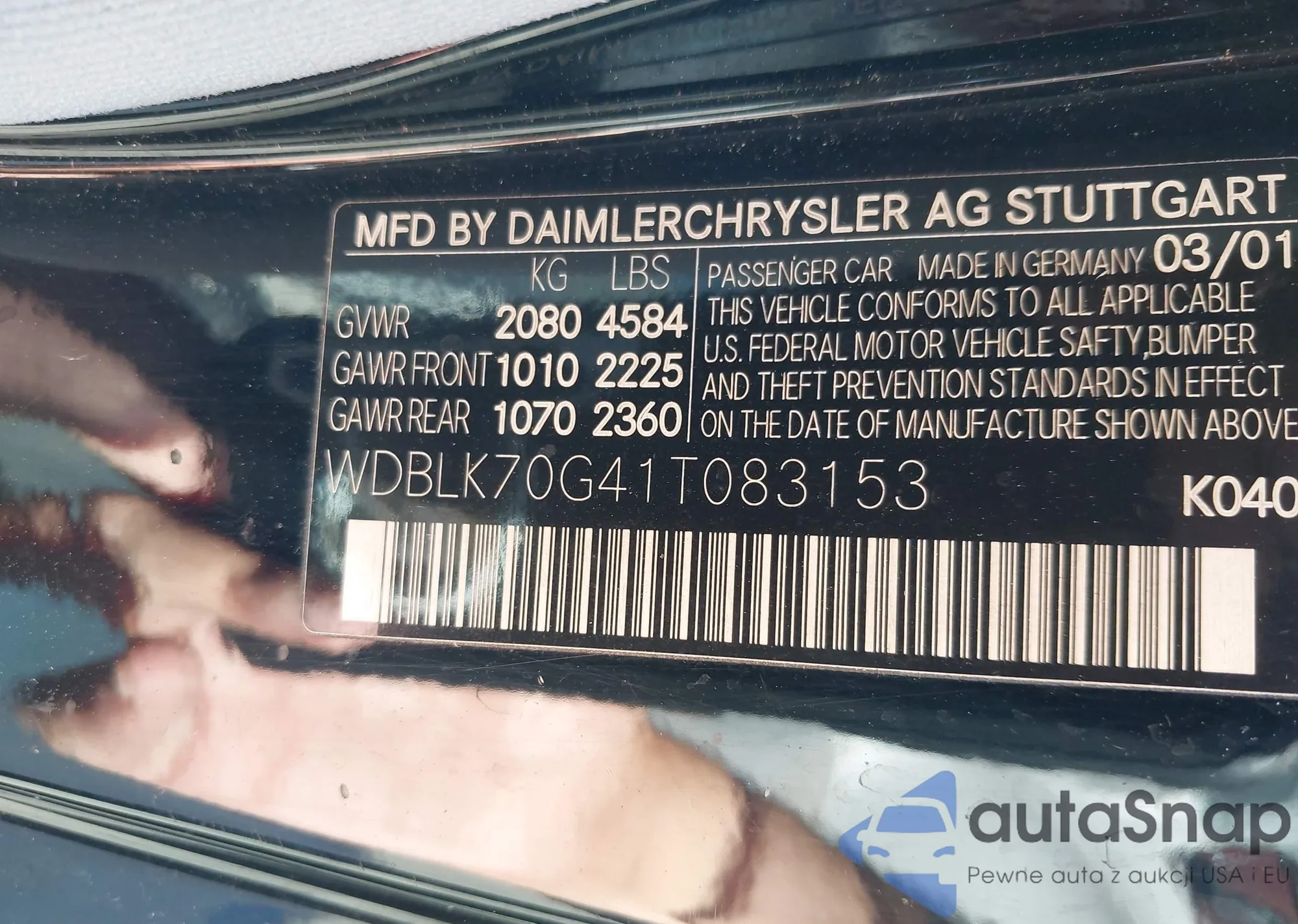 Samochód Mercedes-Benz CLK-klasse 2001 (VIN WDBLK70G41T083153) ma dokumenty uniemożliwiające rejestrację. Mogą pojawić się trudności przy eksporcie i rejestracji. Skontaktuj się z ekspertami AutaSnap w celu znalezienia alternatywy.