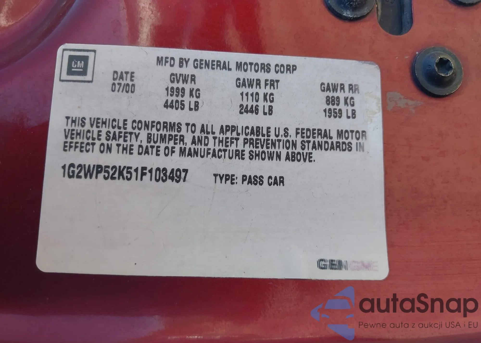 Samochód Pontiac Grand Prix 2001 (VIN 1G2WP52K51F103497) nie był wcześniej licytowany. Dokumenty są czyste, przebieg odpowiada lub jest niższy niż średnia rynku. Sprzedaje go firma ubezpieczeniowa – polecamy zakup. Dostawa do portu zajmie ok. 6–8 tygodni.
