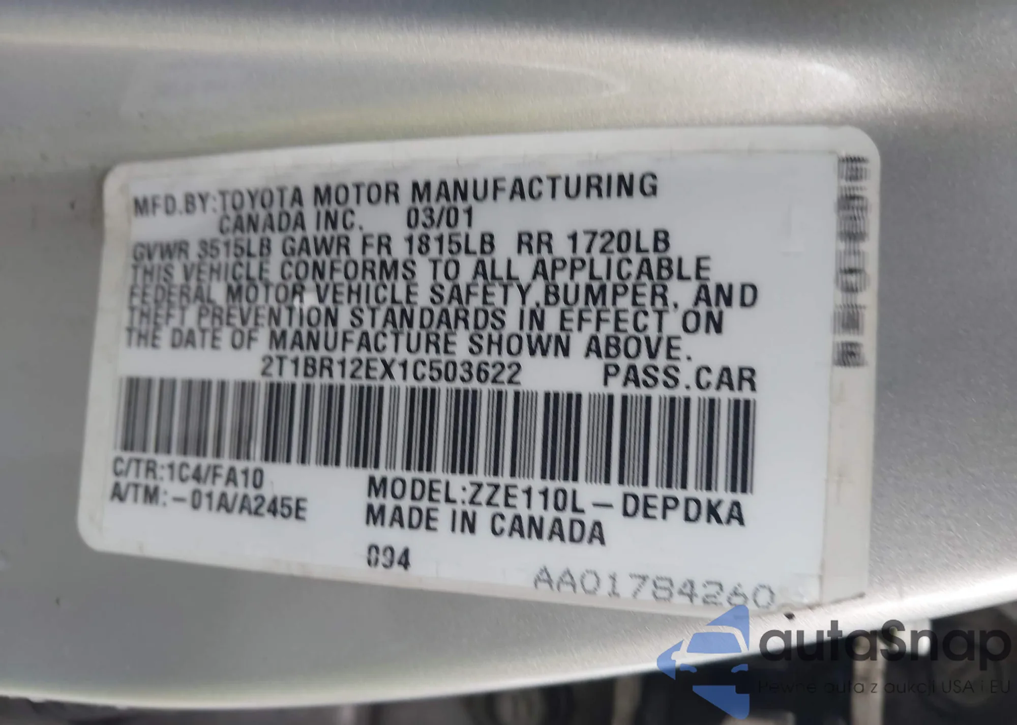 VIN: 2T1BR12EX1C503622
