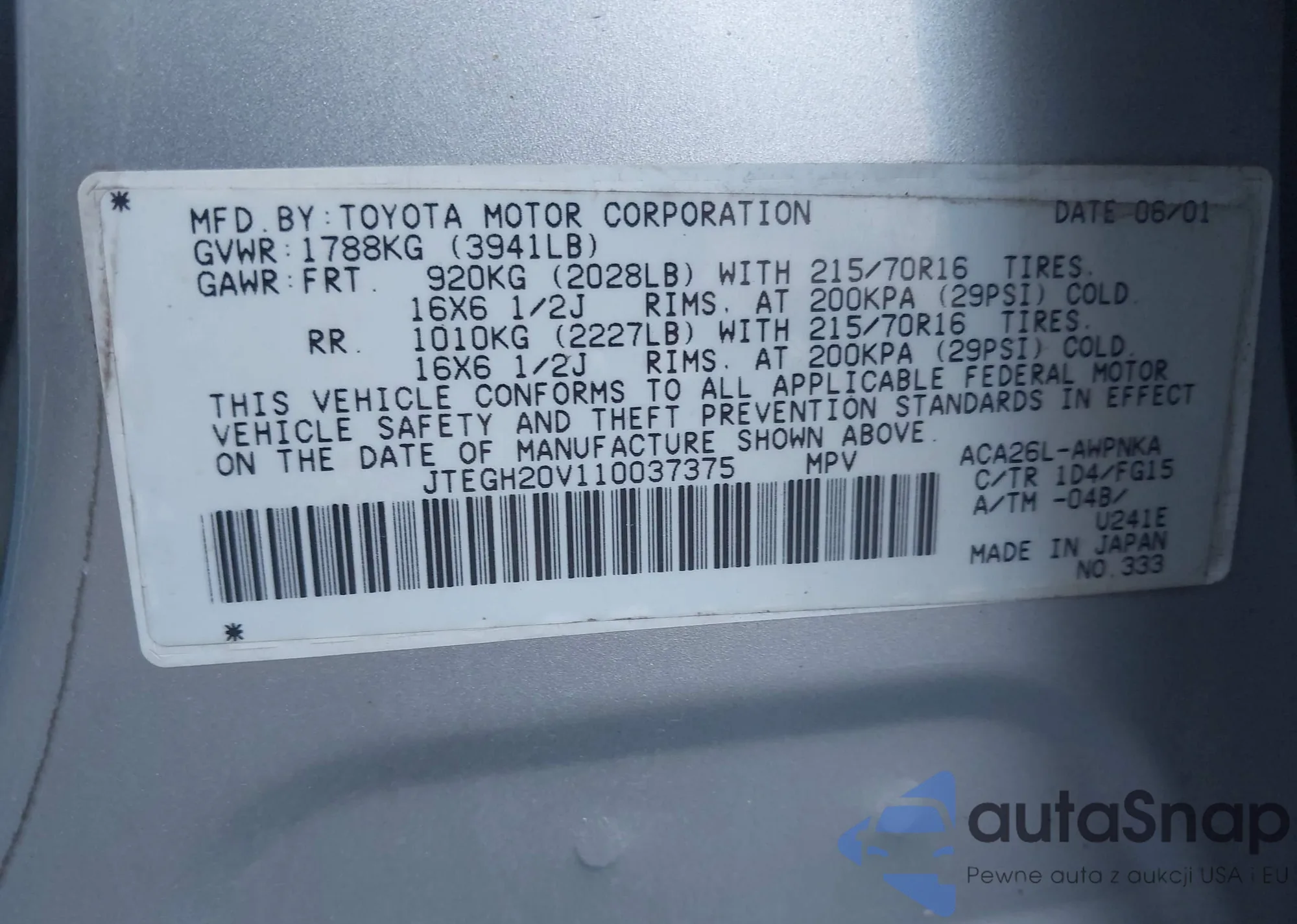 VIN: JTEGH20V110037375