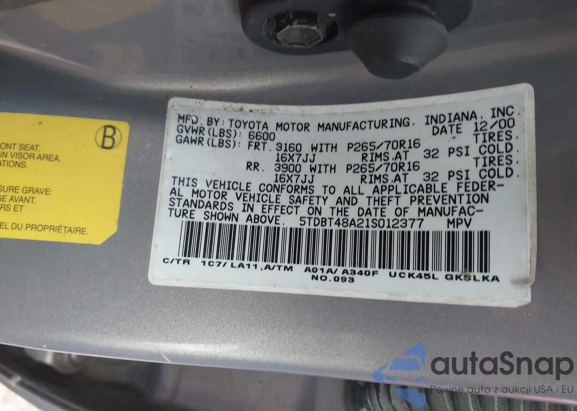 Samochód Toyota Sequoia 2001 (VIN 5TDBT48A21S012377) sprzedaje go niezweryfikowany sprzedawca. Zalecamy raport Carfax i potwierdzenie możliwości rejestracji pojazdu przed zakupem.