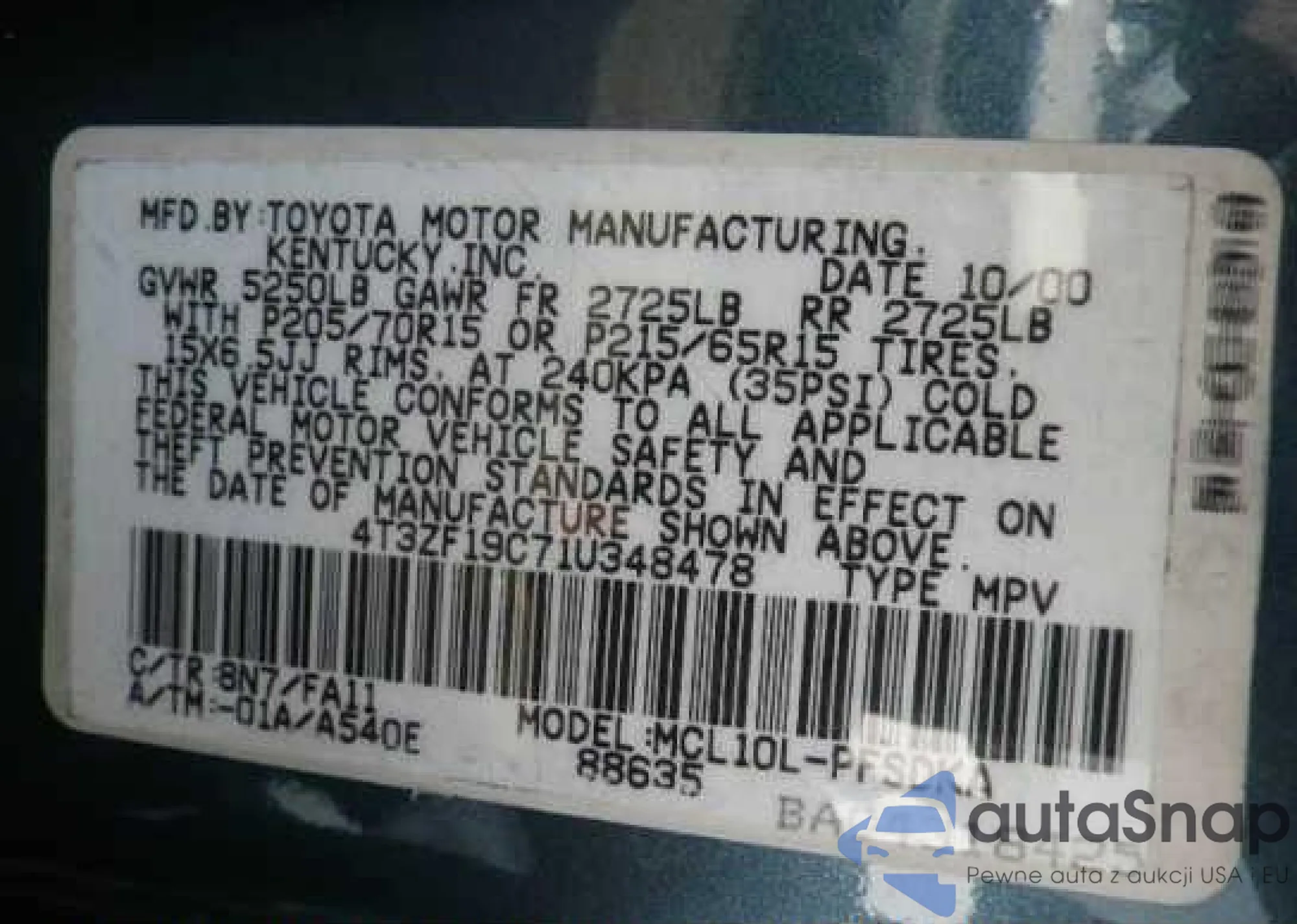 • VIN: 4T3ZF19C71U348478
