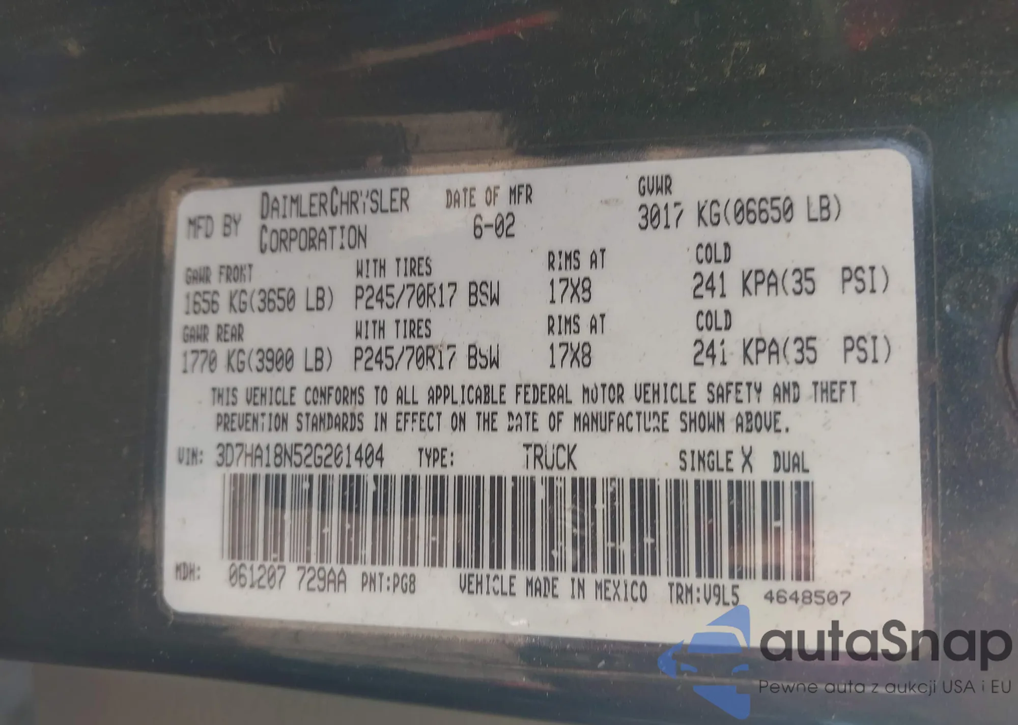 Samochód Dodge RAM 2002 (VIN 3D7HA18N52G201404) nie był wcześniej licytowany. Dokumenty są czyste, przebieg odpowiada lub jest niższy niż średnia rynku. Sprzedaje go firma ubezpieczeniowa – polecamy zakup. Dostawa do portu zajmie ok. 6–8 tygodni.