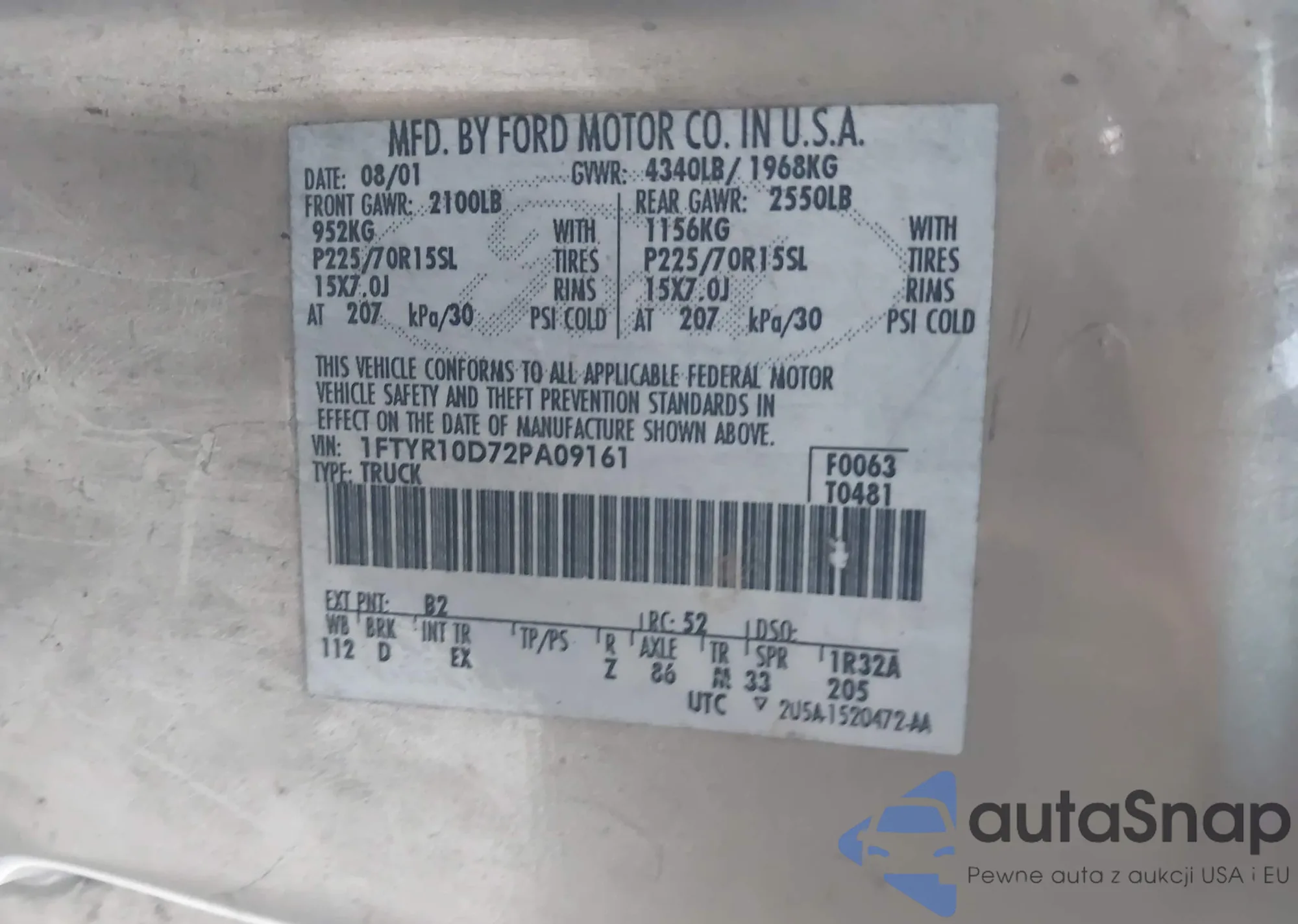 Samochód Ford Ranger 2002 (VIN 1FTYR10D72PA09161) ma dokumenty uniemożliwiające rejestrację. Mogą pojawić się trudności przy eksporcie i rejestracji. Skontaktuj się z ekspertami AutaSnap w celu znalezienia alternatywy.