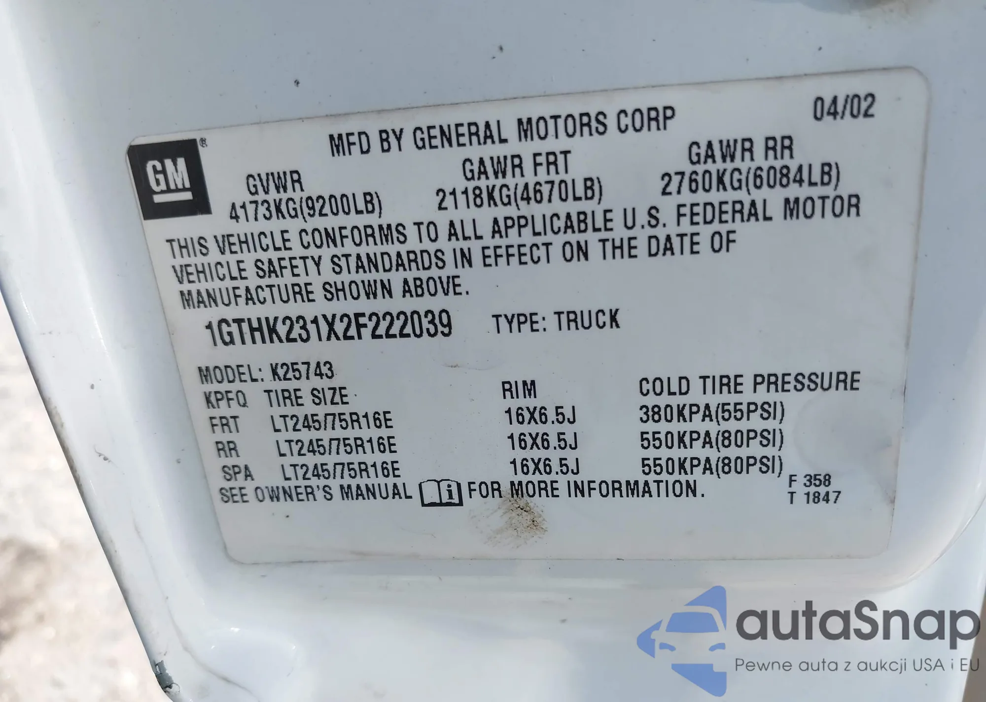 VIN: 1GTHK231X2F222039