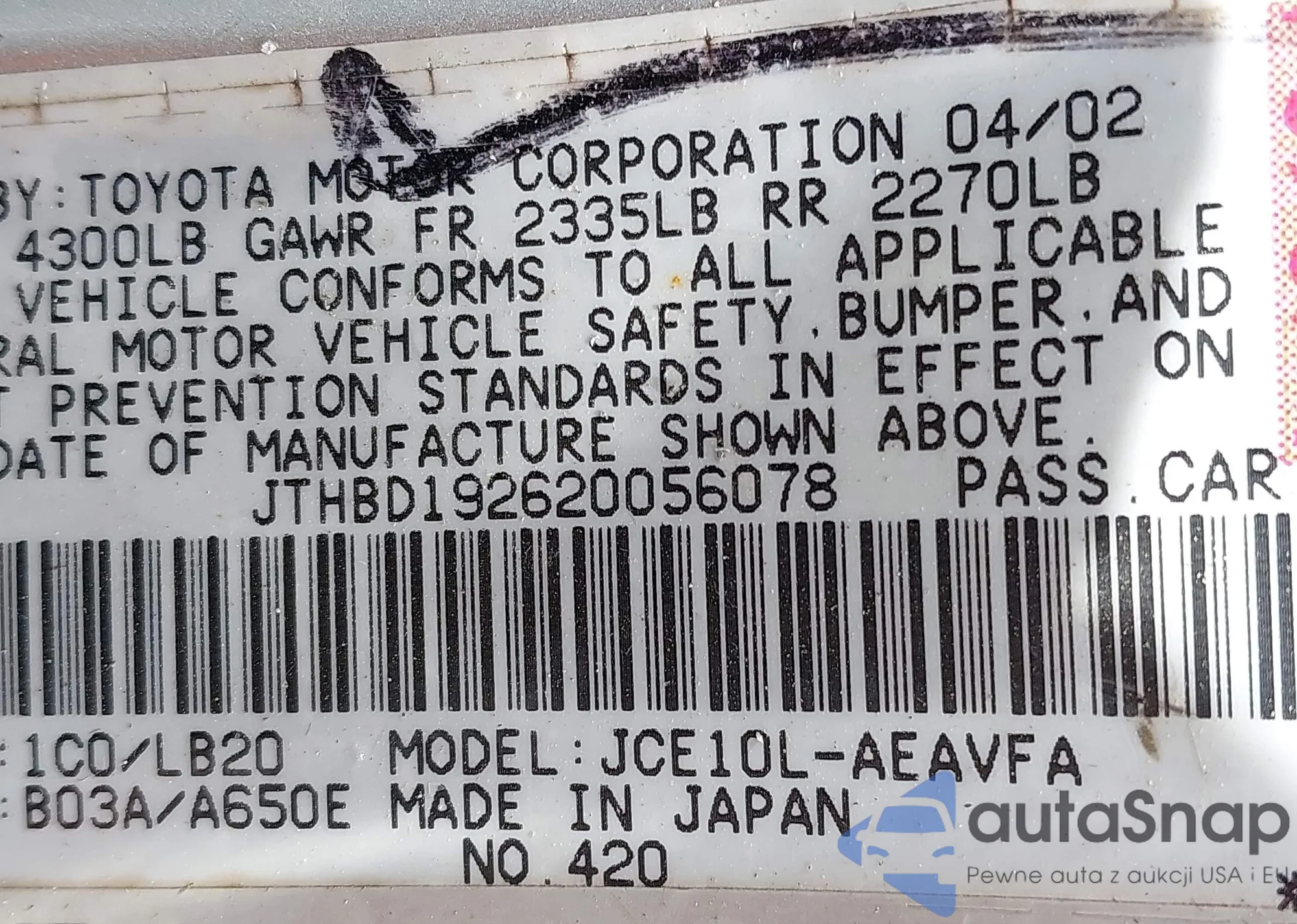 VIN: JTHBD192620056078