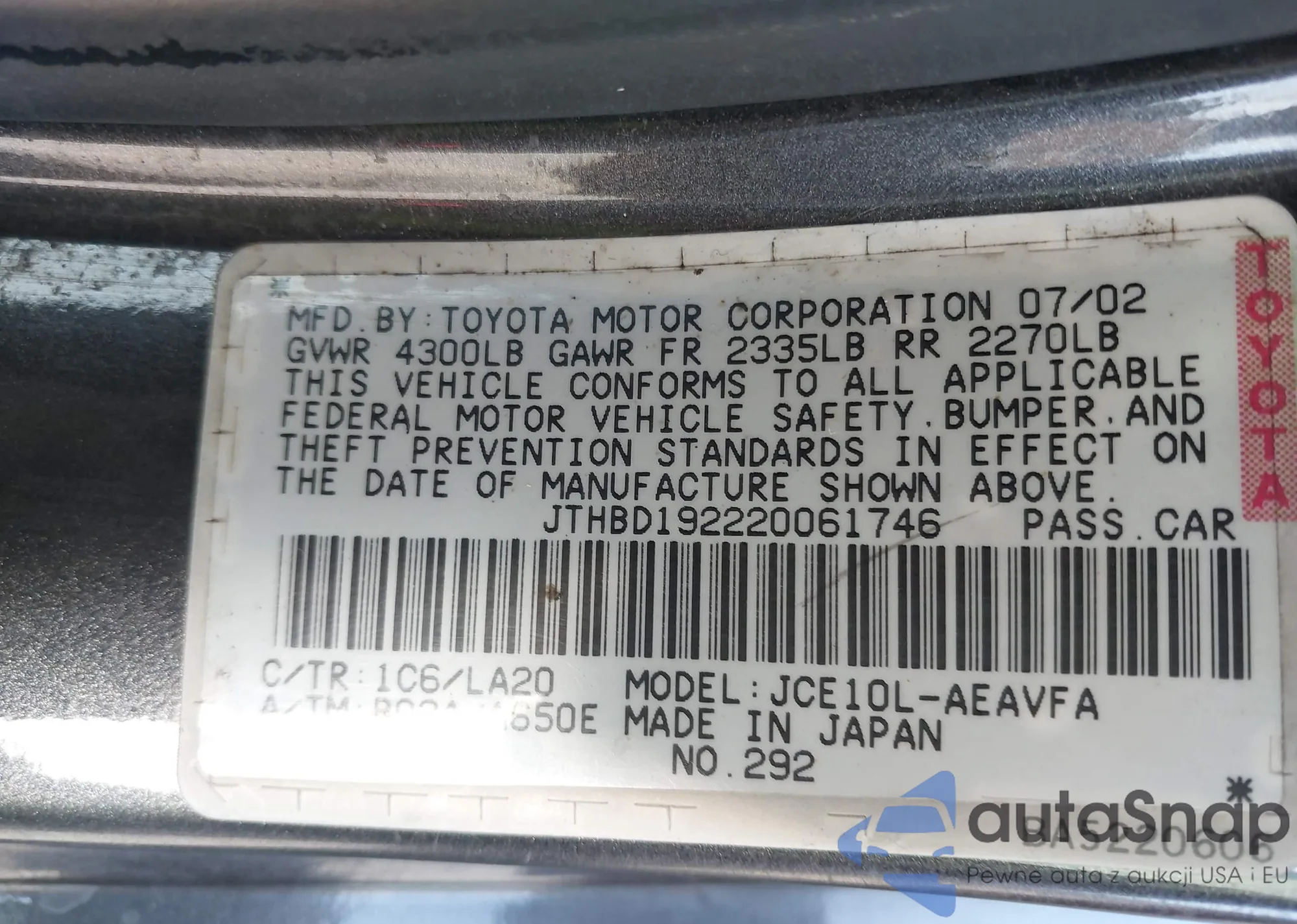VIN: JTHBD192220061746