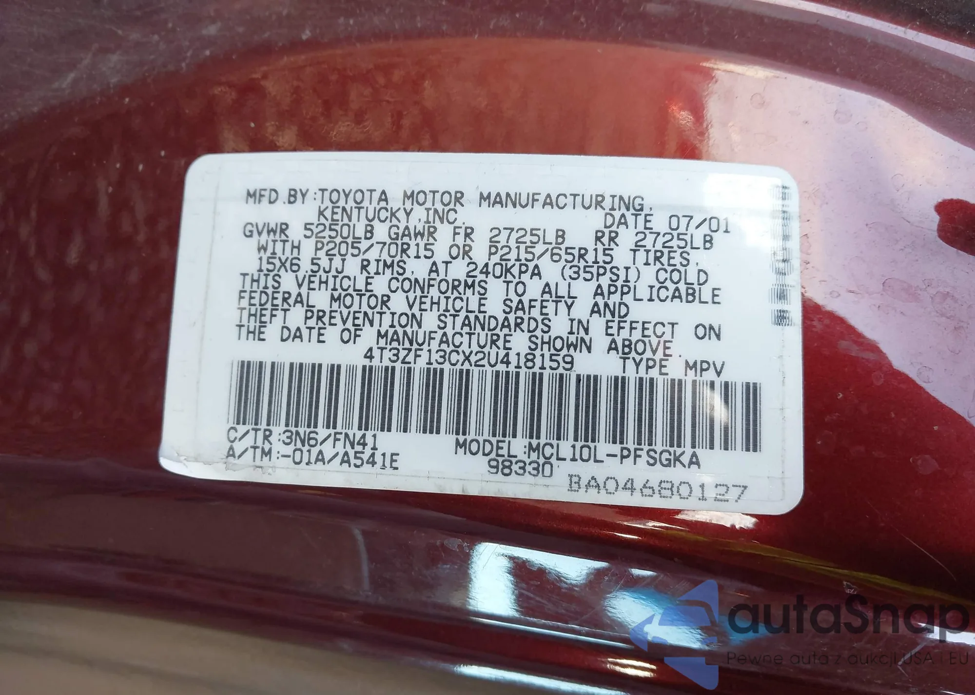 VIN: 4T3ZF13CX2U418159