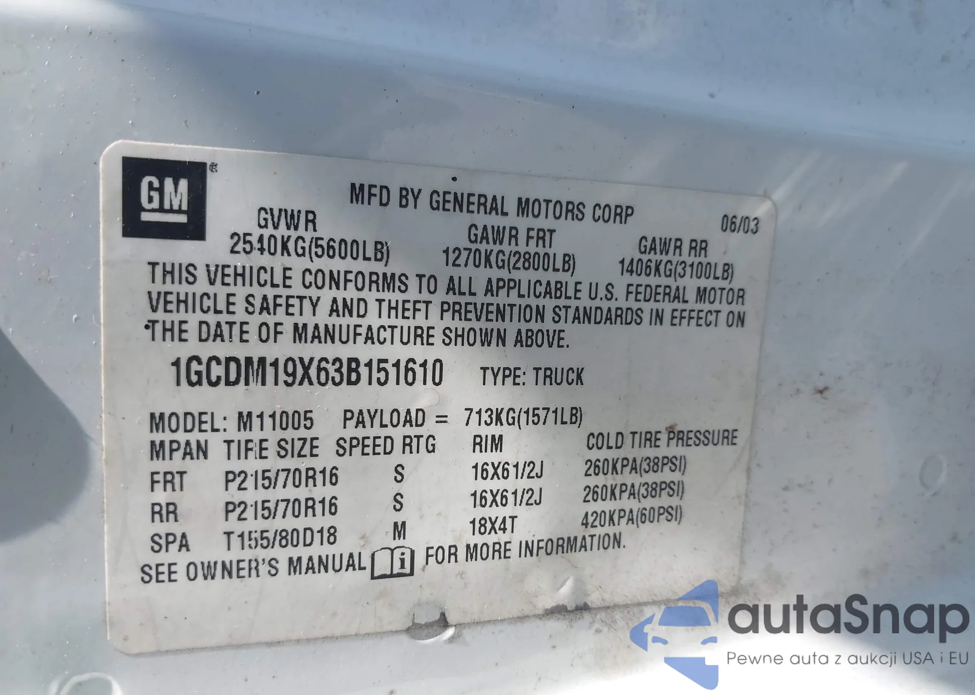 VIN: 1GCDM19X63B151610