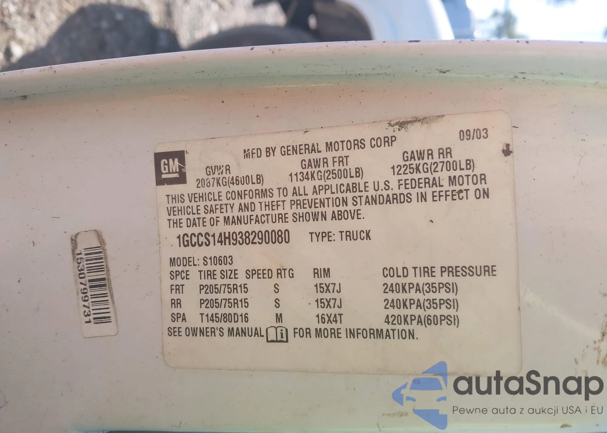 • VIN: 1GCCS14H938290080