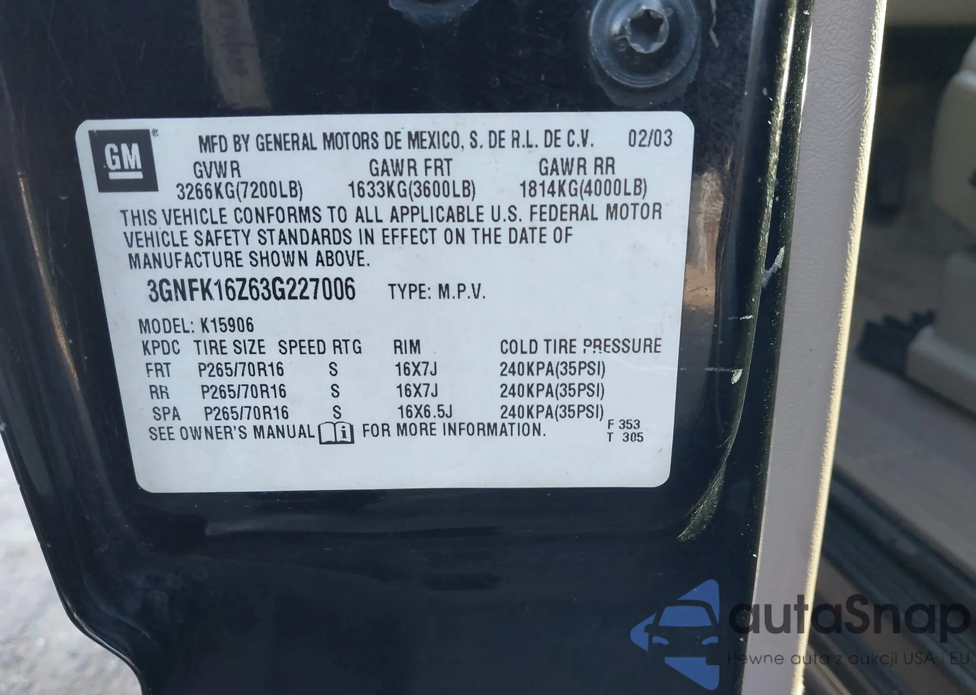 VIN: 3GNFK16Z63G227006