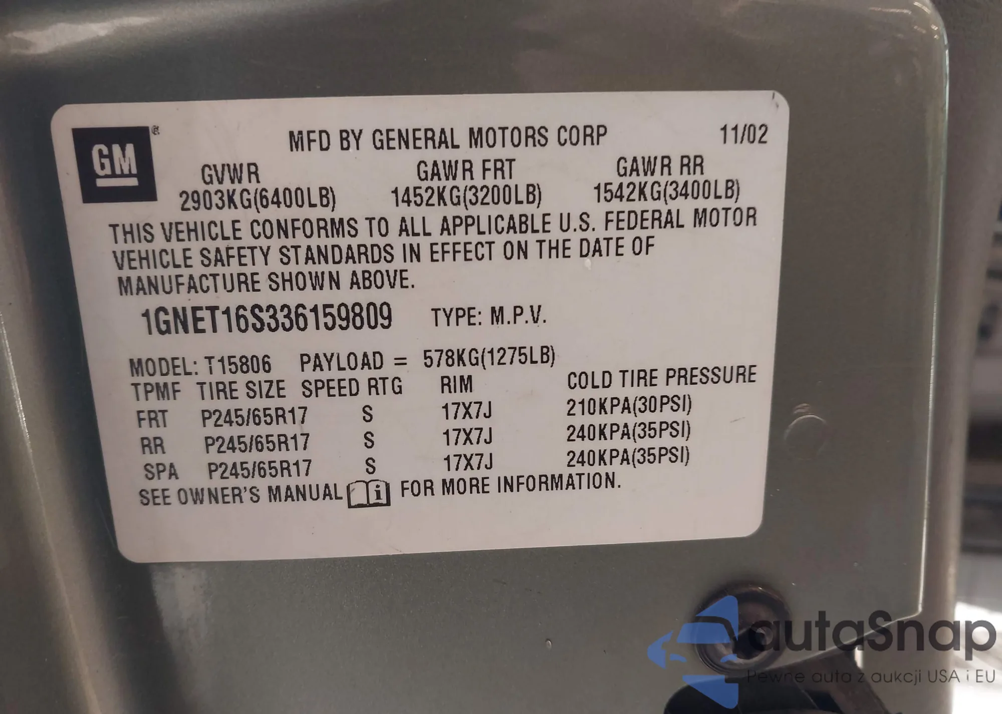 • VIN: 1GNET16S336159809