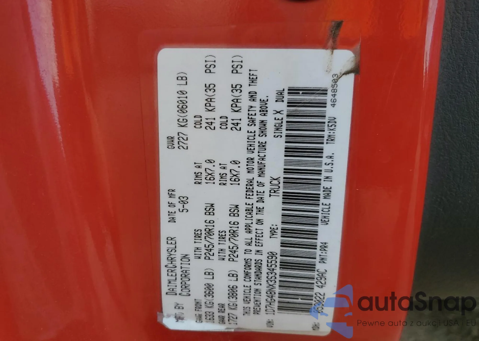VIN: 1D7HG48NX3S345590
