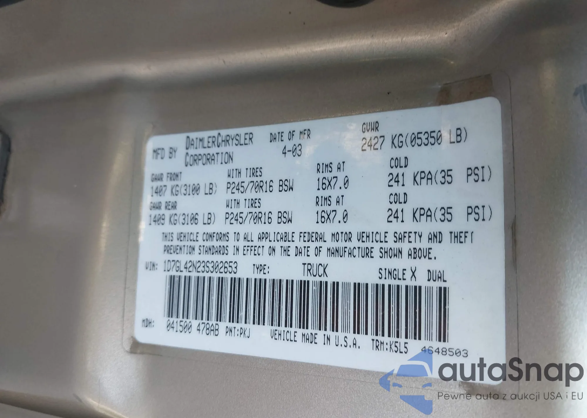 VIN: 1D7GL42N23S302653