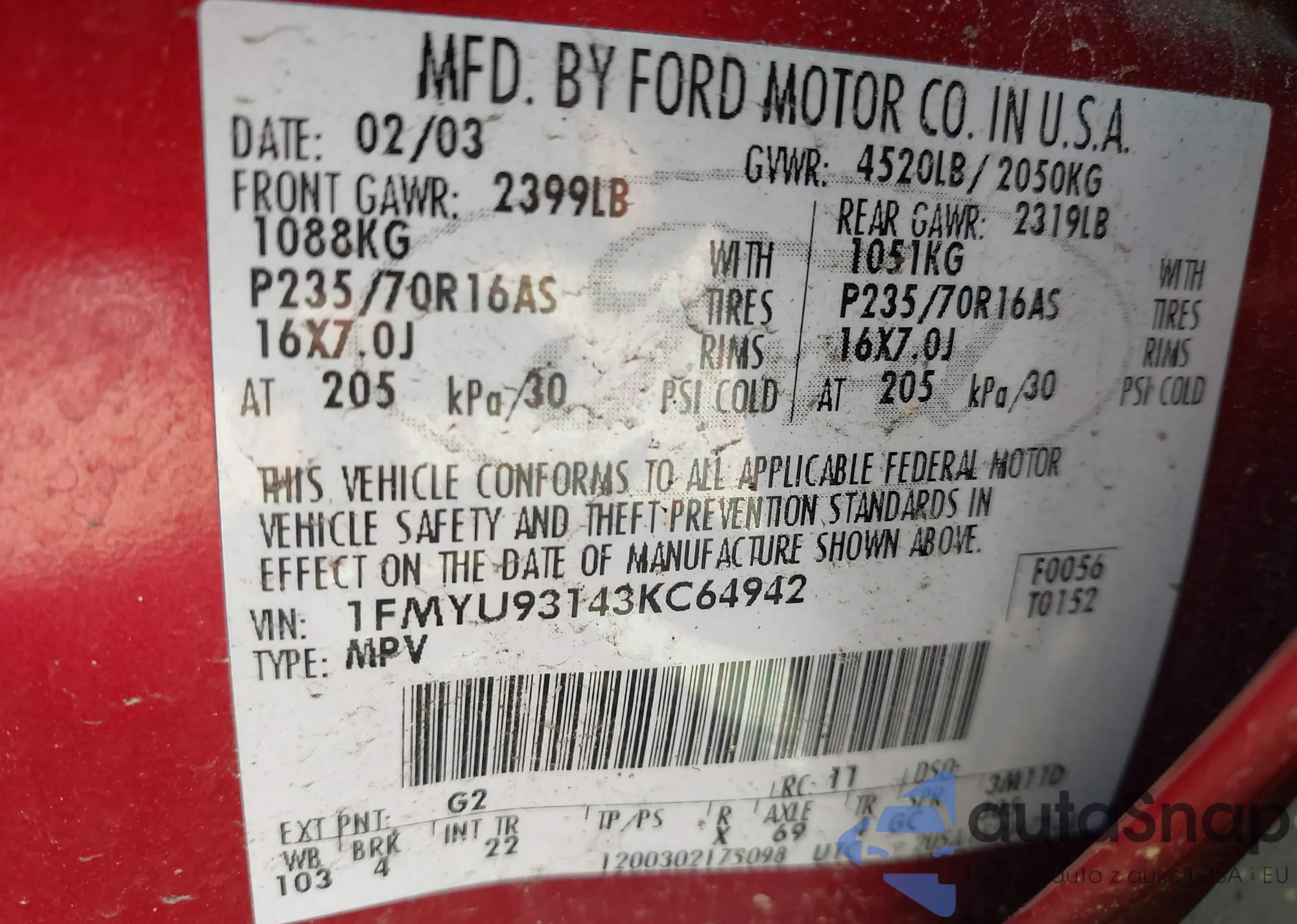 VIN: 1FMYU93143KC64942