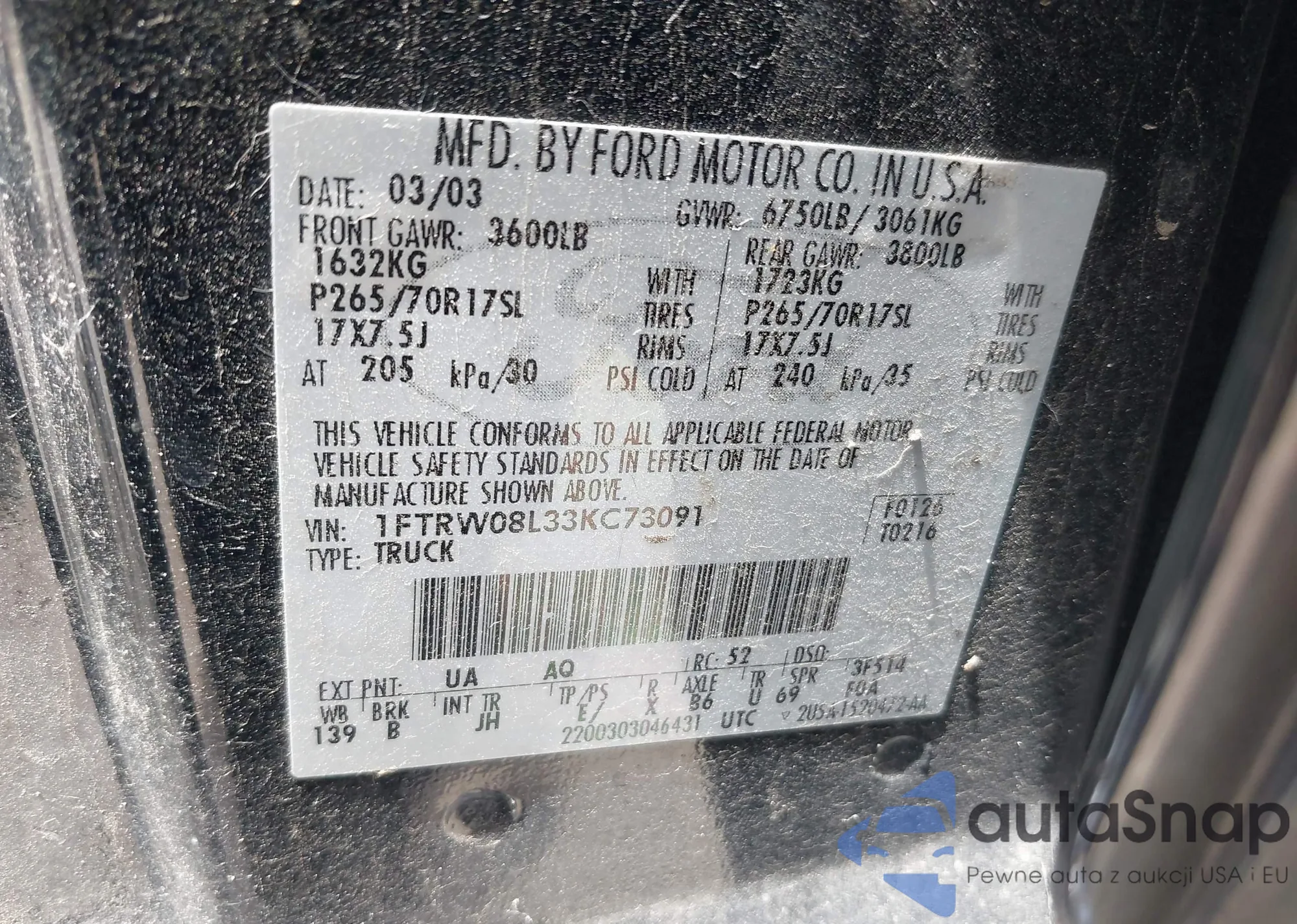 VIN: 1FTRW08L33KC73091
