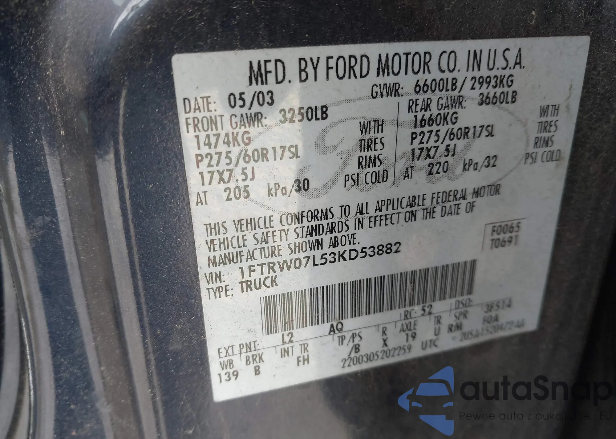 VIN: 1FTRW07L53KD53882