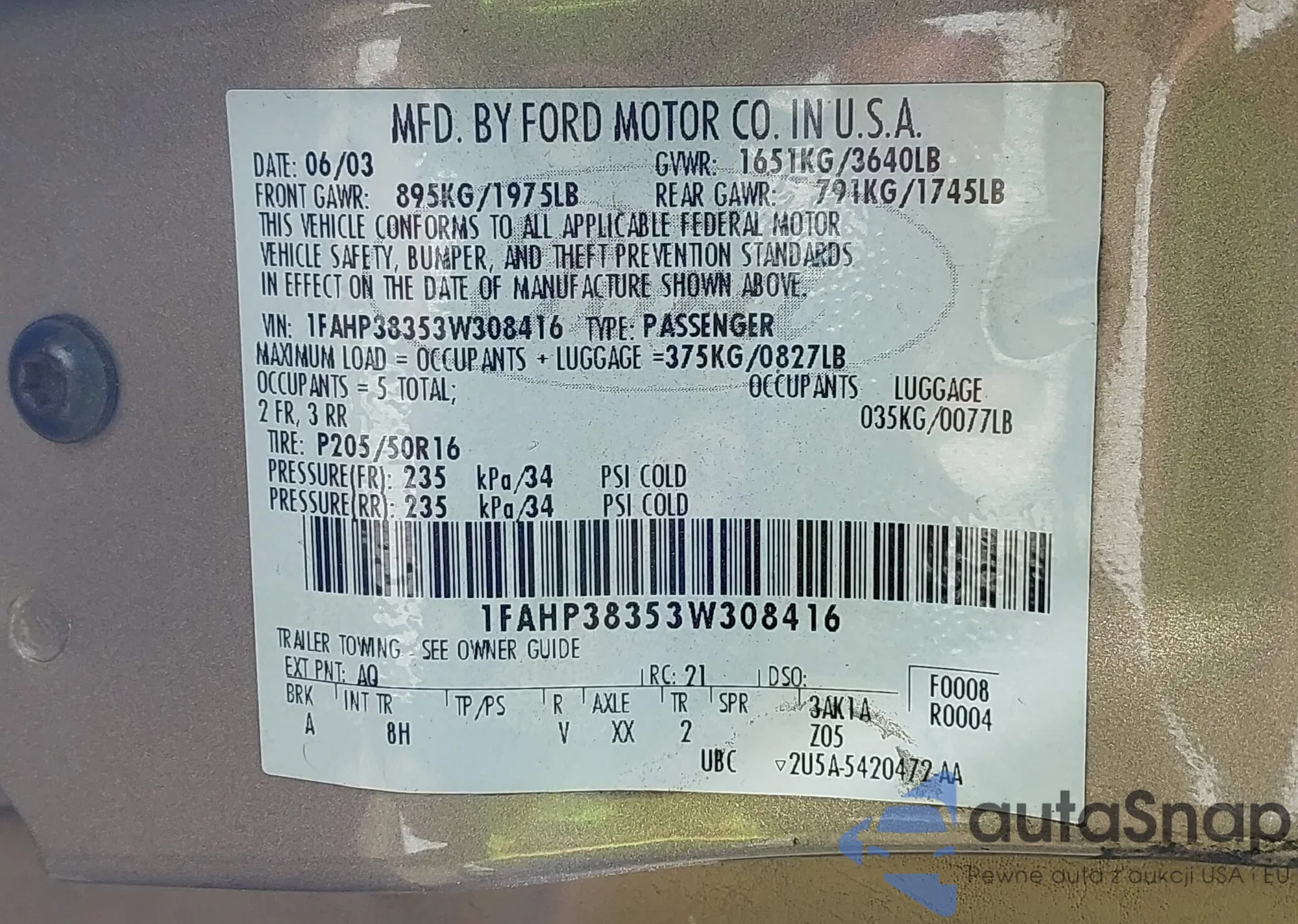 VIN: 1FAHP38353W308416