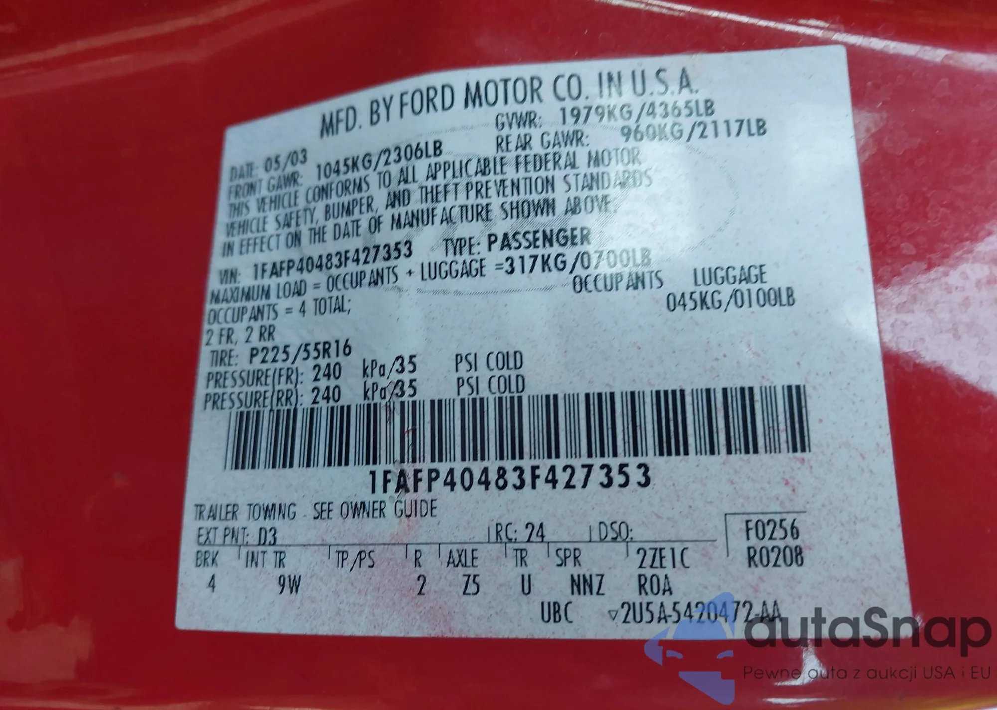 • VIN: 1FAFP40483F427353