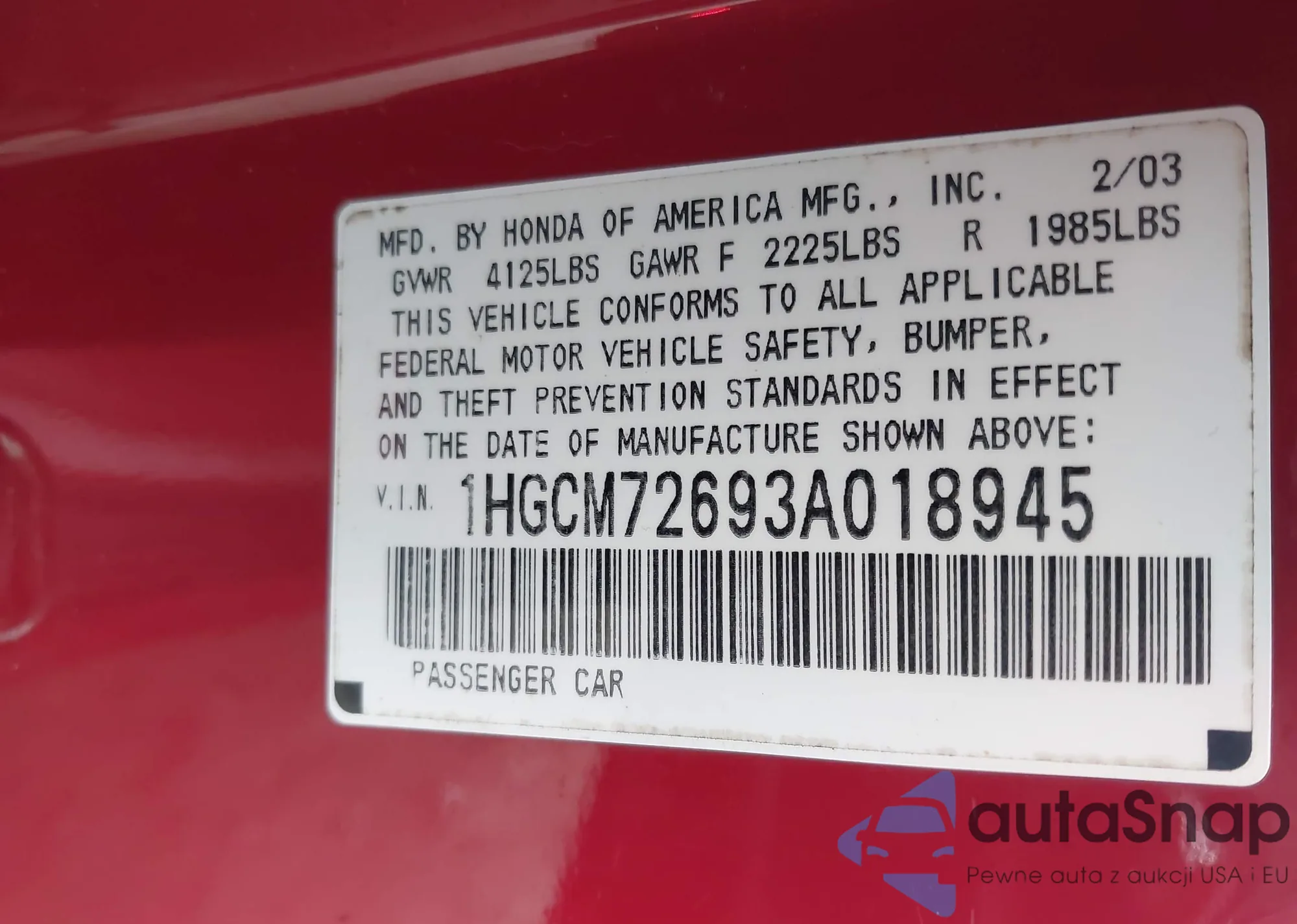 • VIN: 1HGCM72693A018945