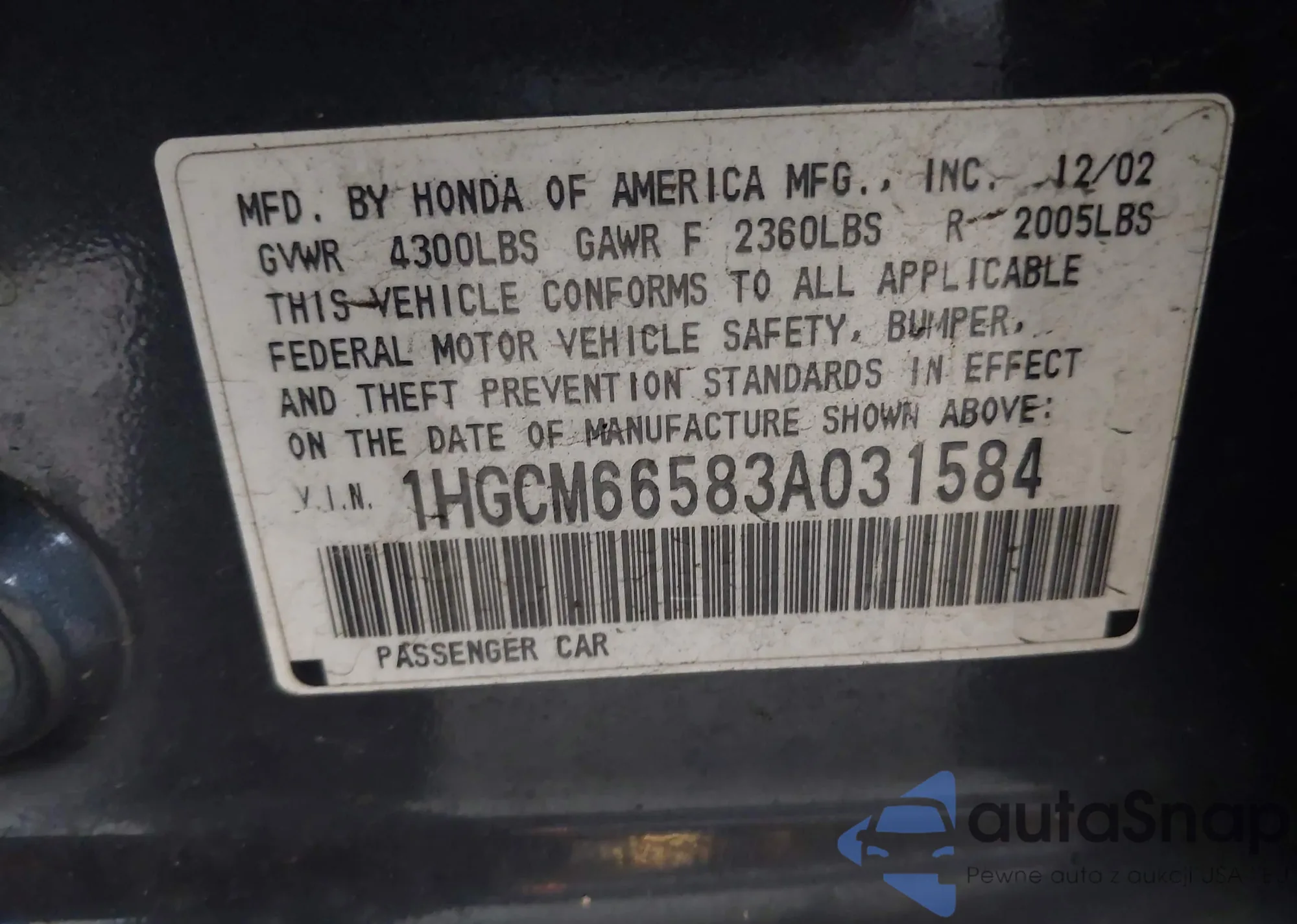 VIN: 1HGCM66583A031584