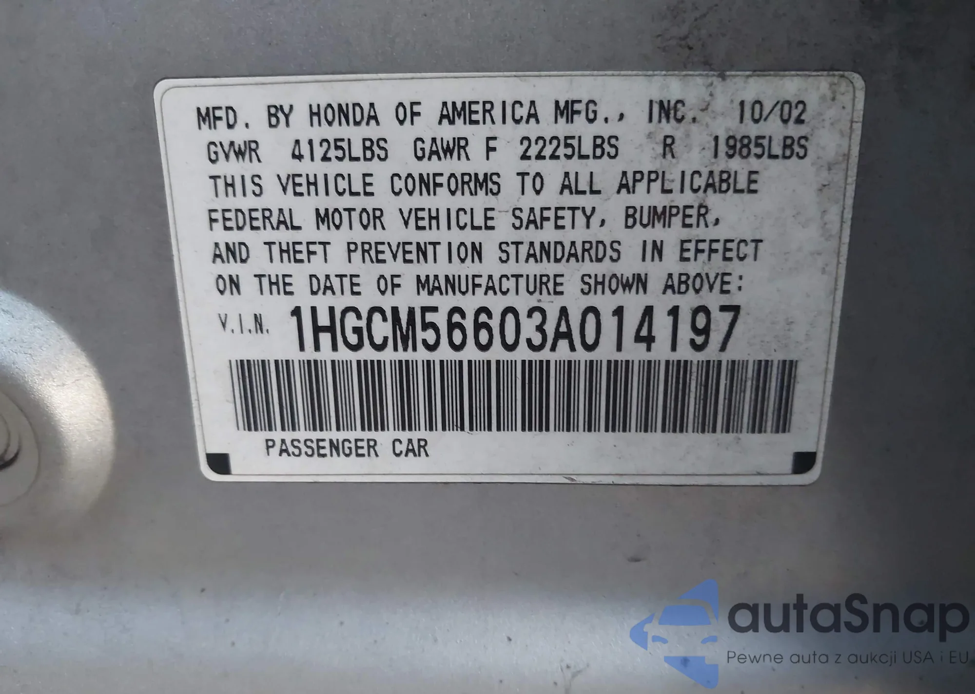 VIN: 1HGCM56603A014197