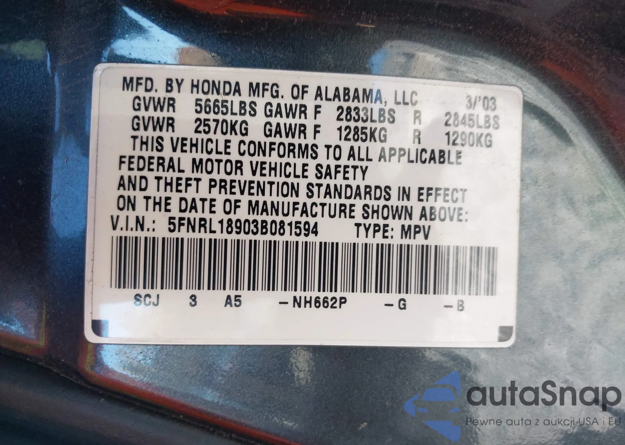 VIN: 5FNRL18903B081594