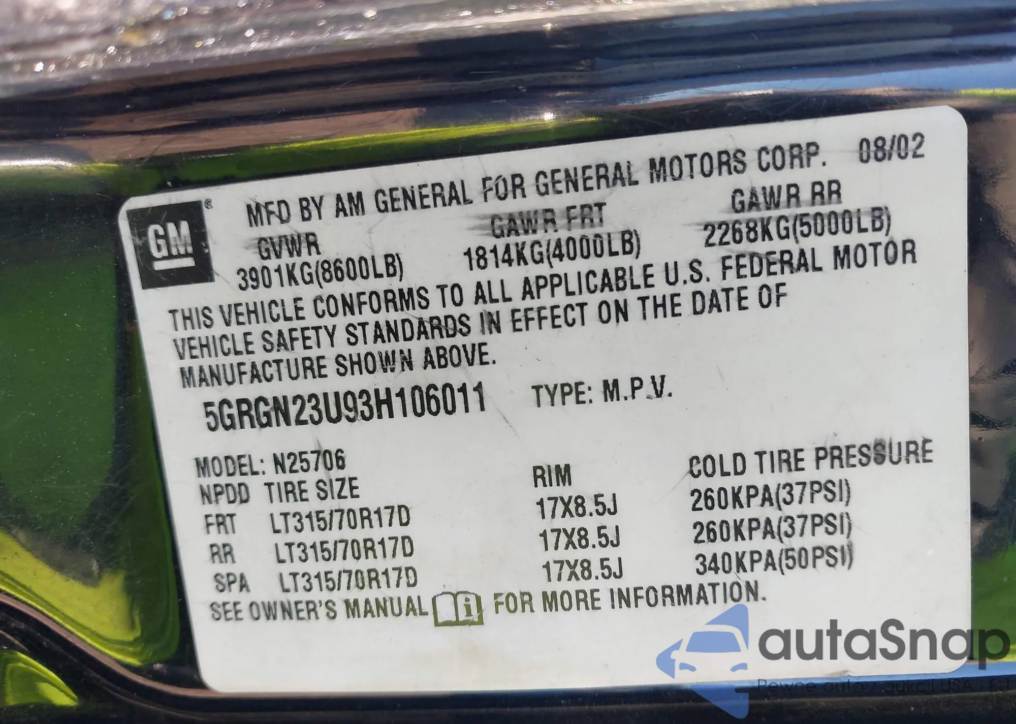 Samochód Hummer H2 2003 (VIN 5GRGN23U93H106011) nie był wcześniej licytowany. Dokumenty są czyste, przebieg odpowiada lub jest niższy niż średnia rynku. Sprzedaje go firma ubezpieczeniowa – polecamy zakup. Dostawa do portu zajmie ok. 6–8 tygodni.