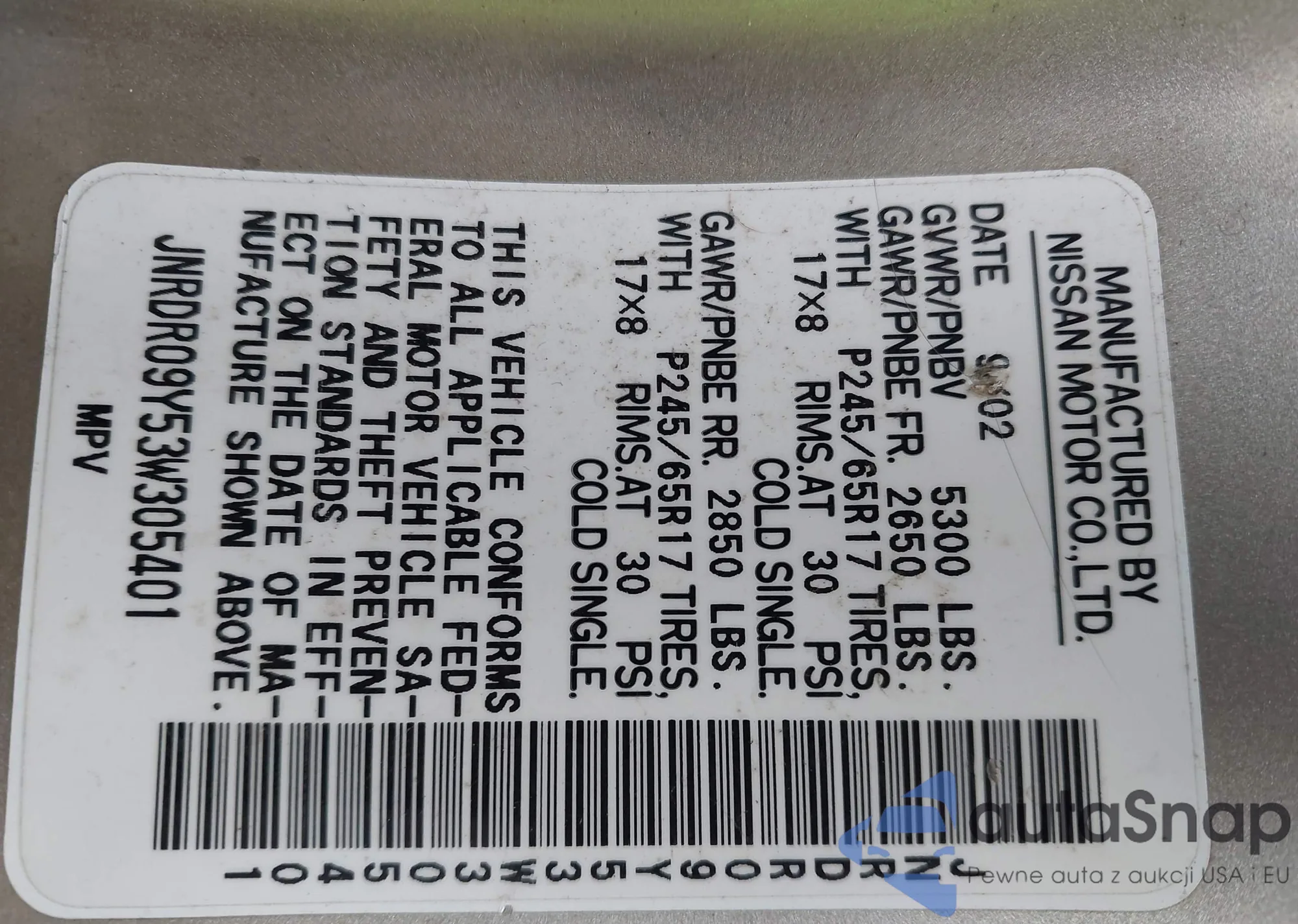 VIN: JNRDR09Y53W305401