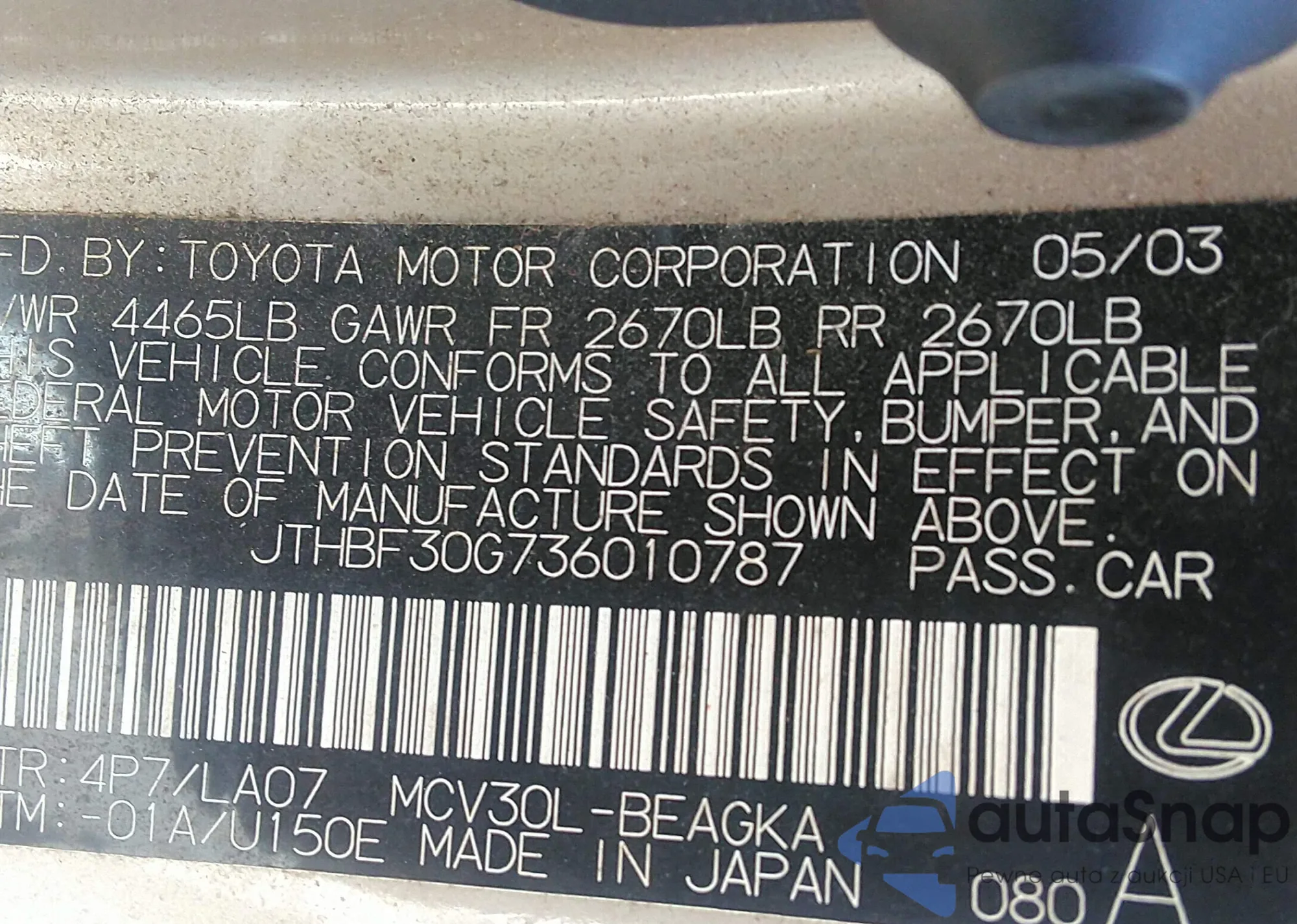 VIN: JTHBF30G736010787