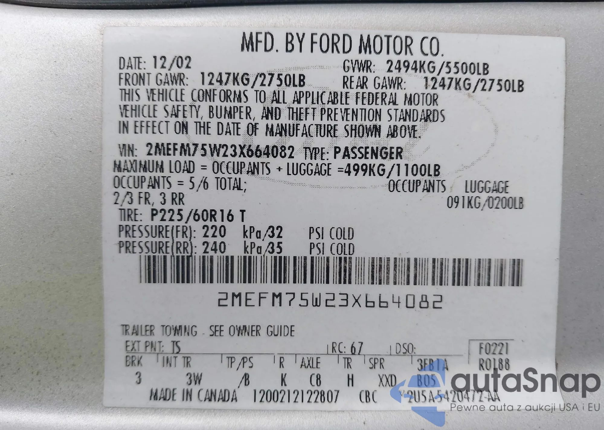 • VIN: 2MEFM75W23X664082