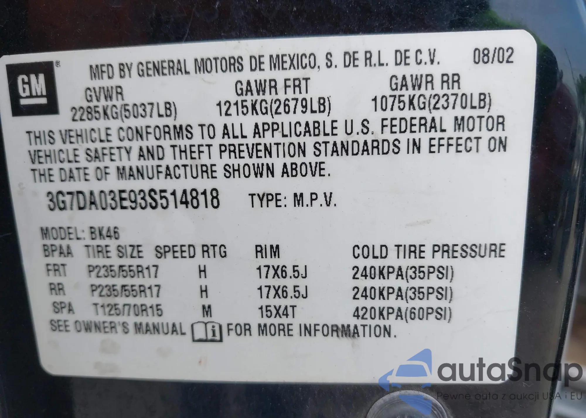 Samochód Pontiac Aztek 2003 (VIN 3G7DA03E93S514818) nie był wcześniej licytowany. Dokumenty są czyste, przebieg odpowiada lub jest niższy niż średnia rynku. Sprzedaje go firma ubezpieczeniowa – polecamy zakup. Dostawa do portu zajmie ok. 6–8 tygodni.