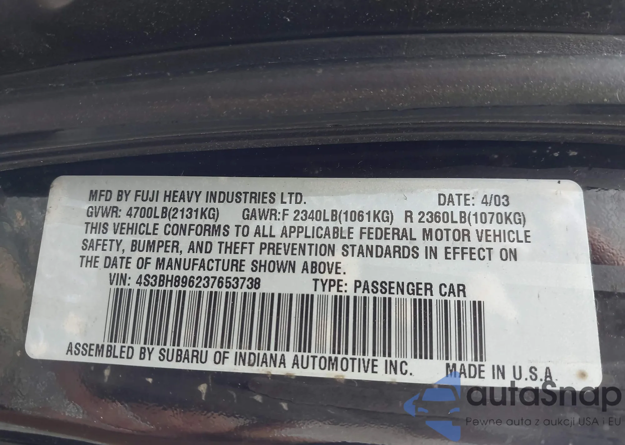 VIN: 4S3BH896237653738