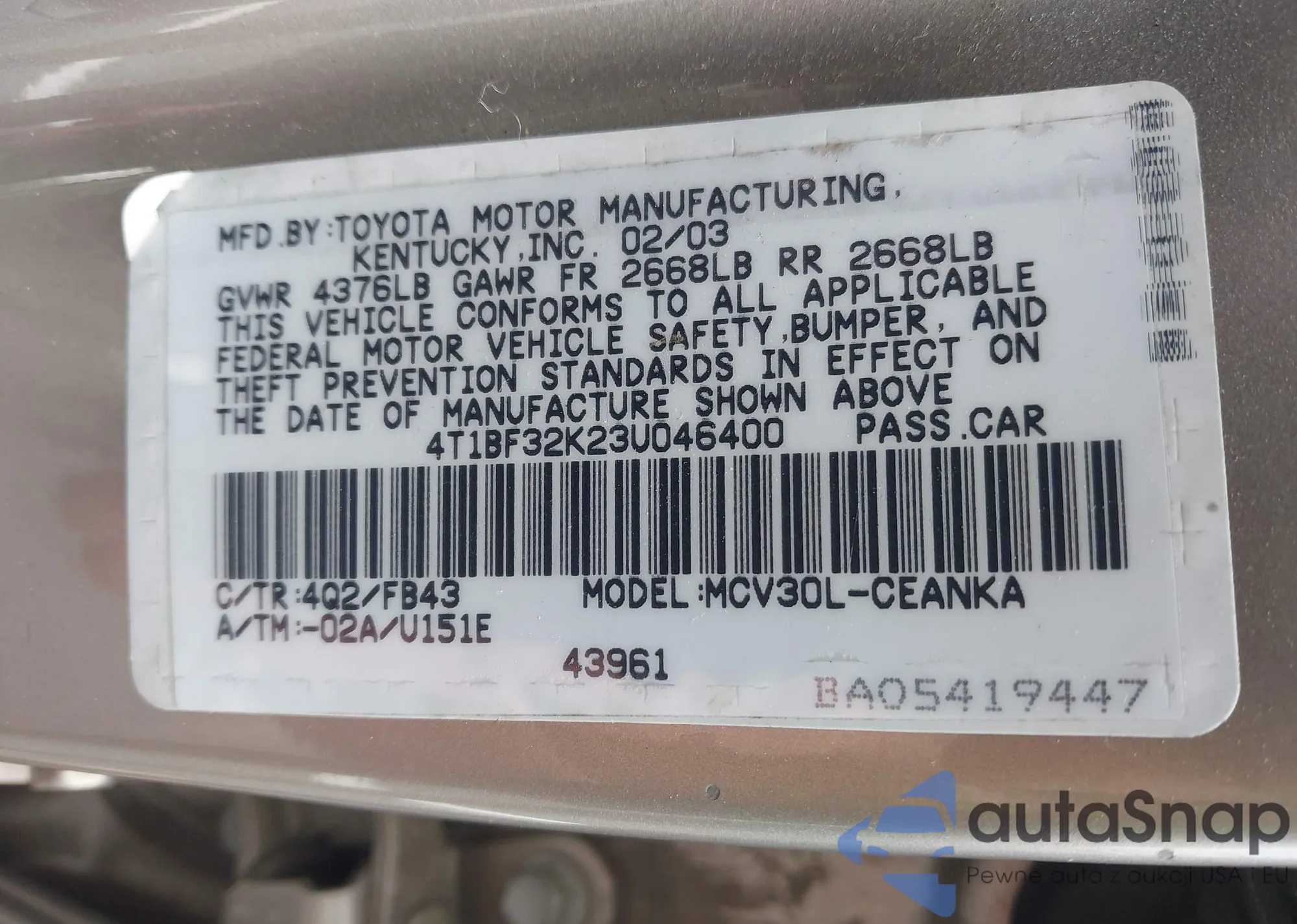 VIN: 4T1BF32K23U046400