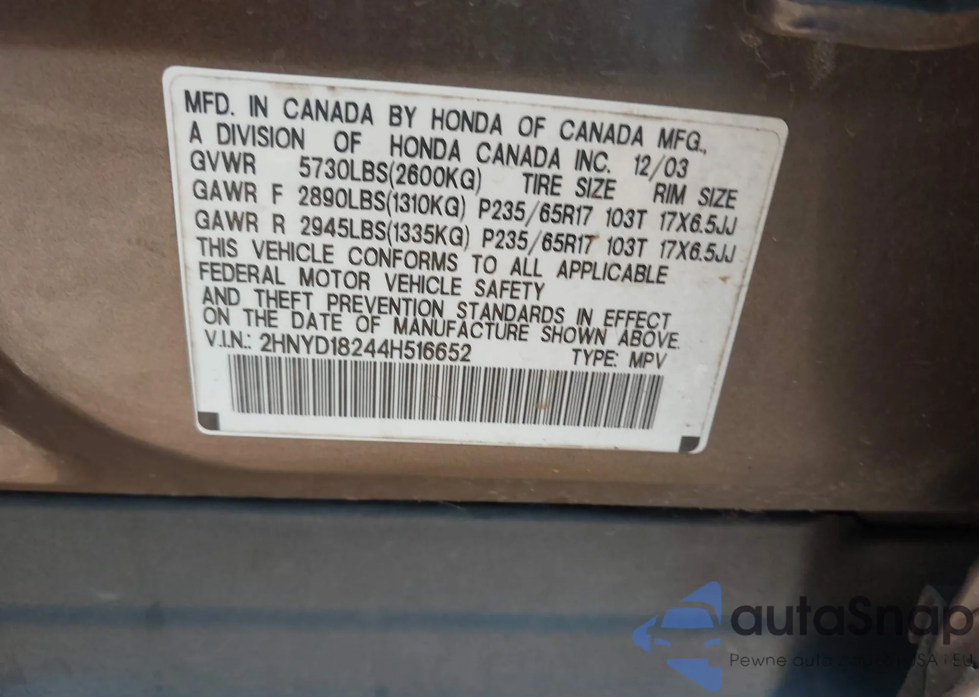 VIN: 2HNYD18244H516652