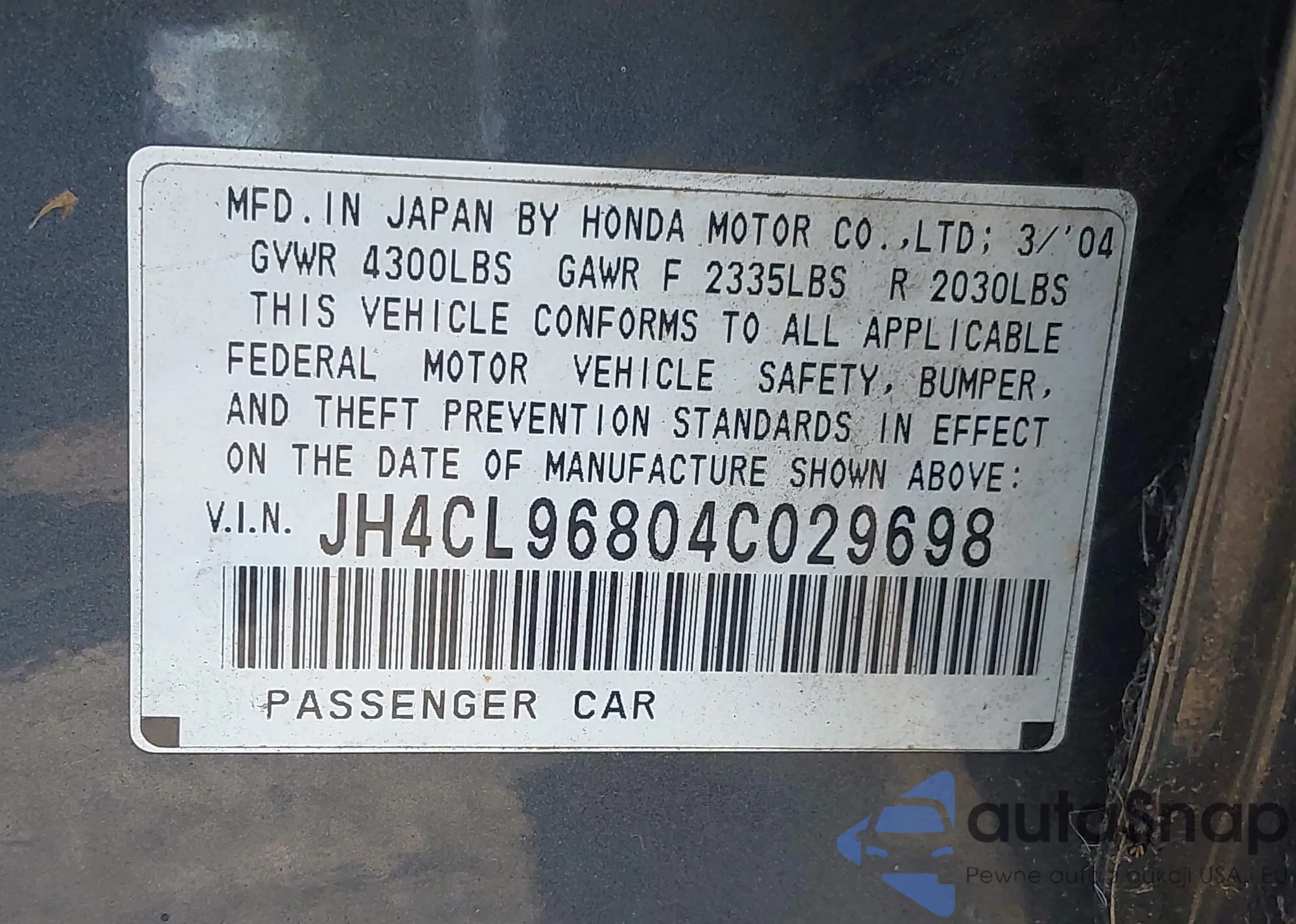 VIN: JH4CL96804C029698