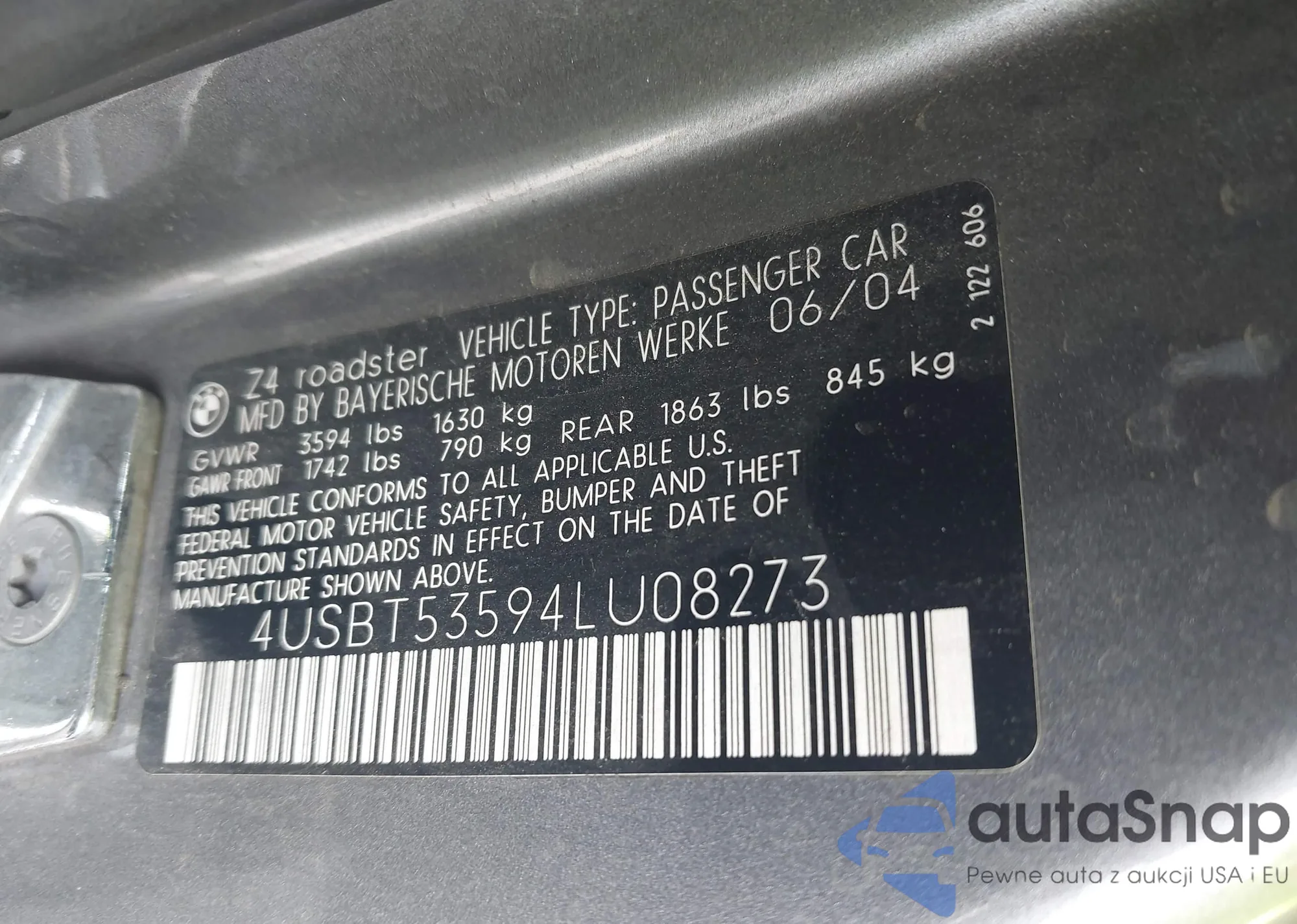 Samochód BMW Z4 2004 (VIN 4USBT53594LU08273) ma dokumenty uniemożliwiające rejestrację. Mogą pojawić się trudności przy eksporcie i rejestracji. Skontaktuj się z ekspertami AutaSnap w celu znalezienia alternatywy.