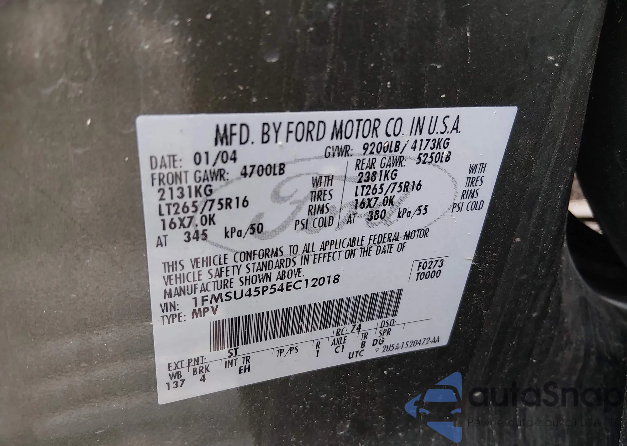 • VIN: 1FMSU45P54EC12018