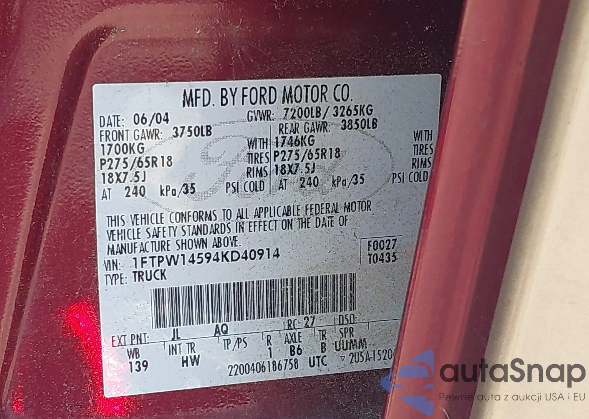 VIN: 1FTPW14594KD40914