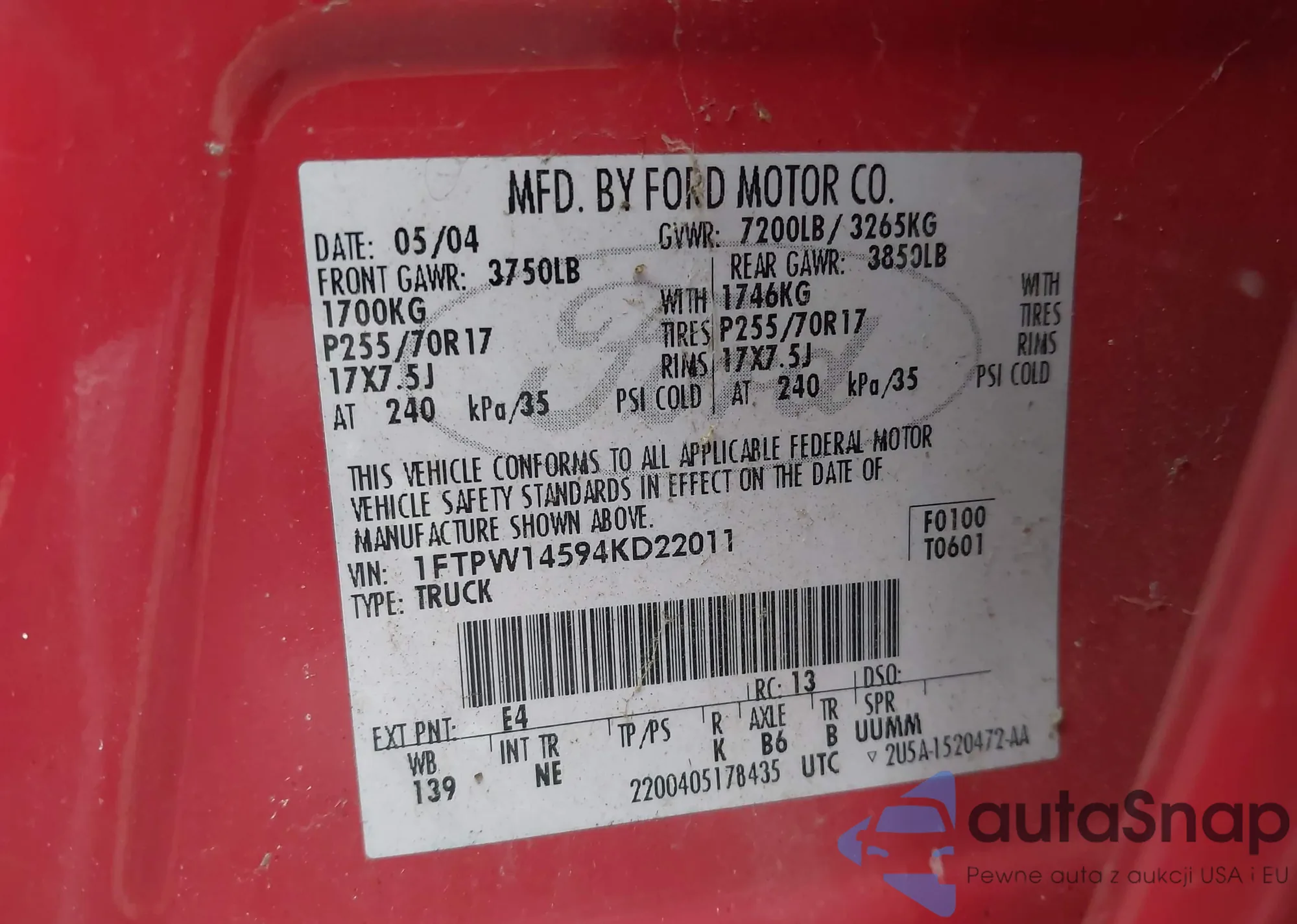 Samochód Ford F-150 2004 (VIN 1FTPW14594KD22011) nie był wcześniej licytowany. Dokumenty są czyste, przebieg odpowiada lub jest niższy niż średnia rynku. Sprzedaje go firma ubezpieczeniowa – polecamy zakup. Dostawa do portu zajmie ok. 6–8 tygodni.