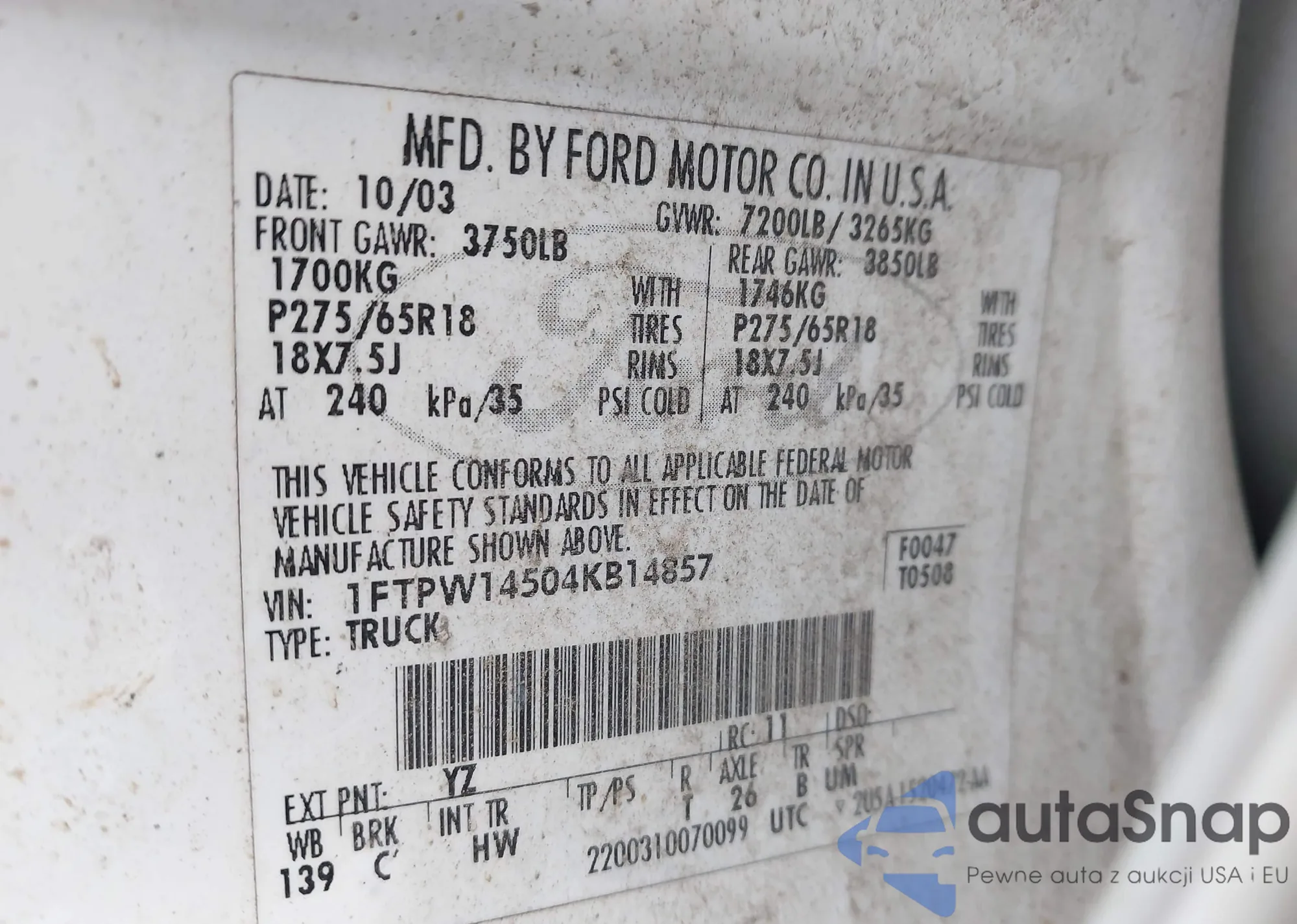 VIN: 1FTPW14504KB14857
