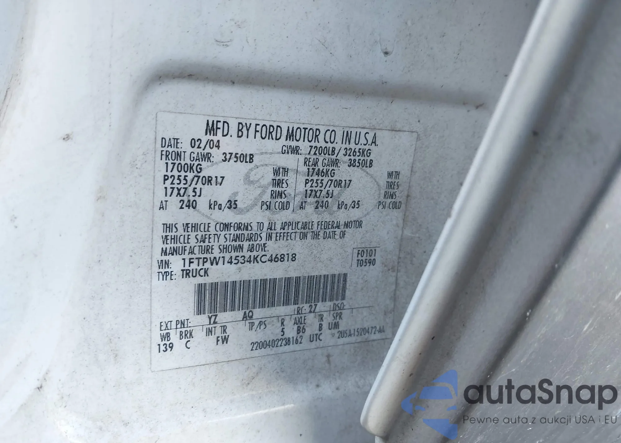 Samochód Ford F-150 2004 (VIN 1FTPW14534KC46818) nie był wcześniej licytowany. Dokumenty są czyste, przebieg odpowiada lub jest niższy niż średnia rynku. Sprzedaje go firma ubezpieczeniowa – polecamy zakup. Dostawa do portu zajmie ok. 6–8 tygodni.