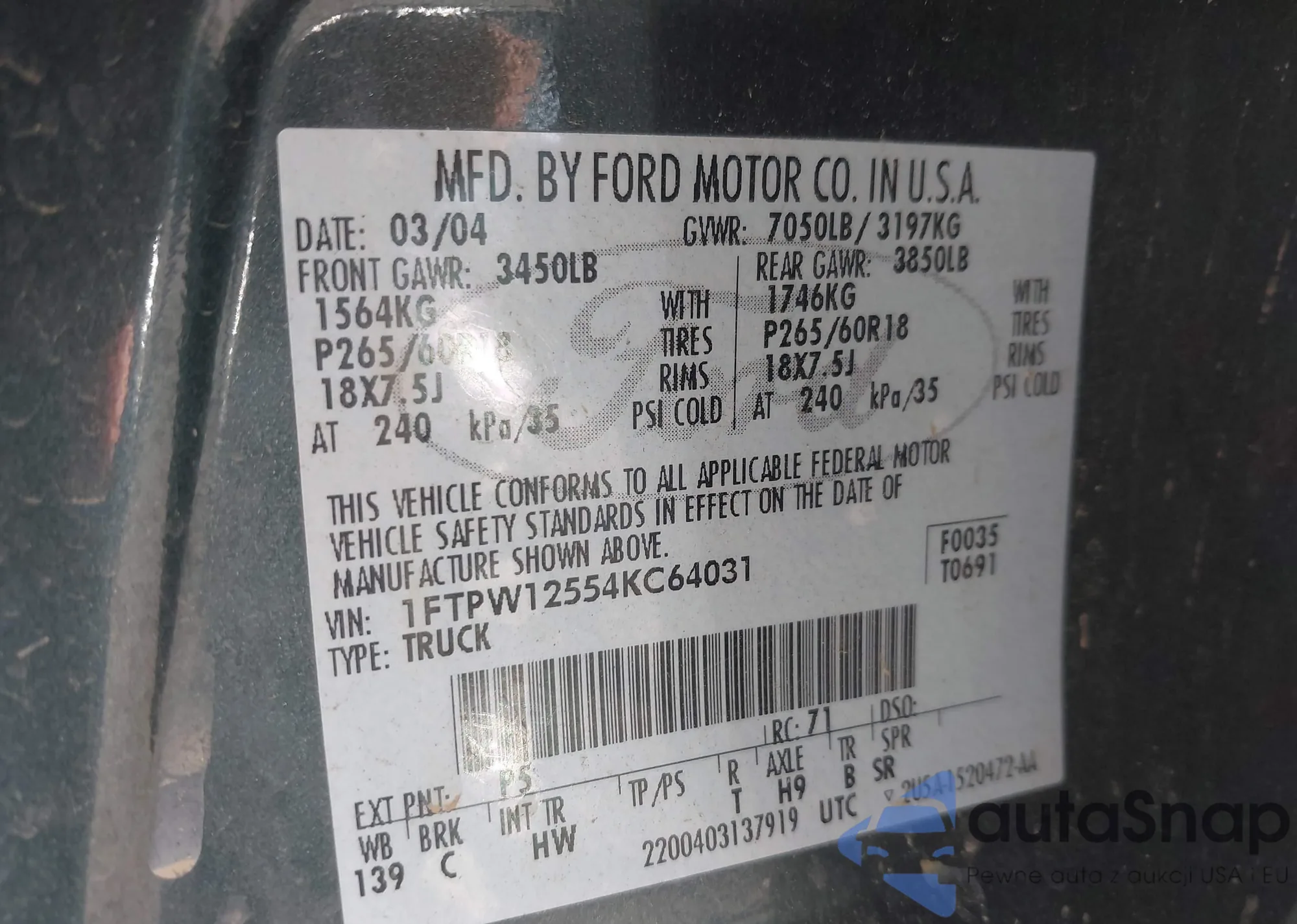 Samochód Ford F-150 2004 (VIN 1FTPW12554KC64031) nie był wcześniej licytowany. Dokumenty są czyste, przebieg odpowiada lub jest niższy niż średnia rynku. Sprzedaje go firma ubezpieczeniowa – polecamy zakup. Dostawa do portu zajmie ok. 6–8 tygodni.