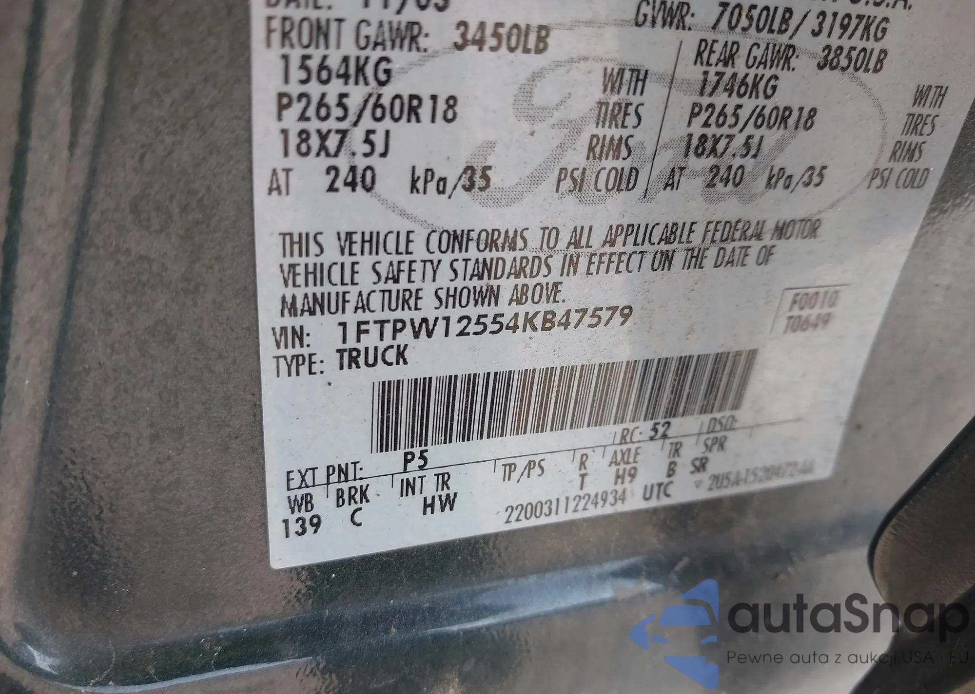 VIN: 1FTPW12554KB47579